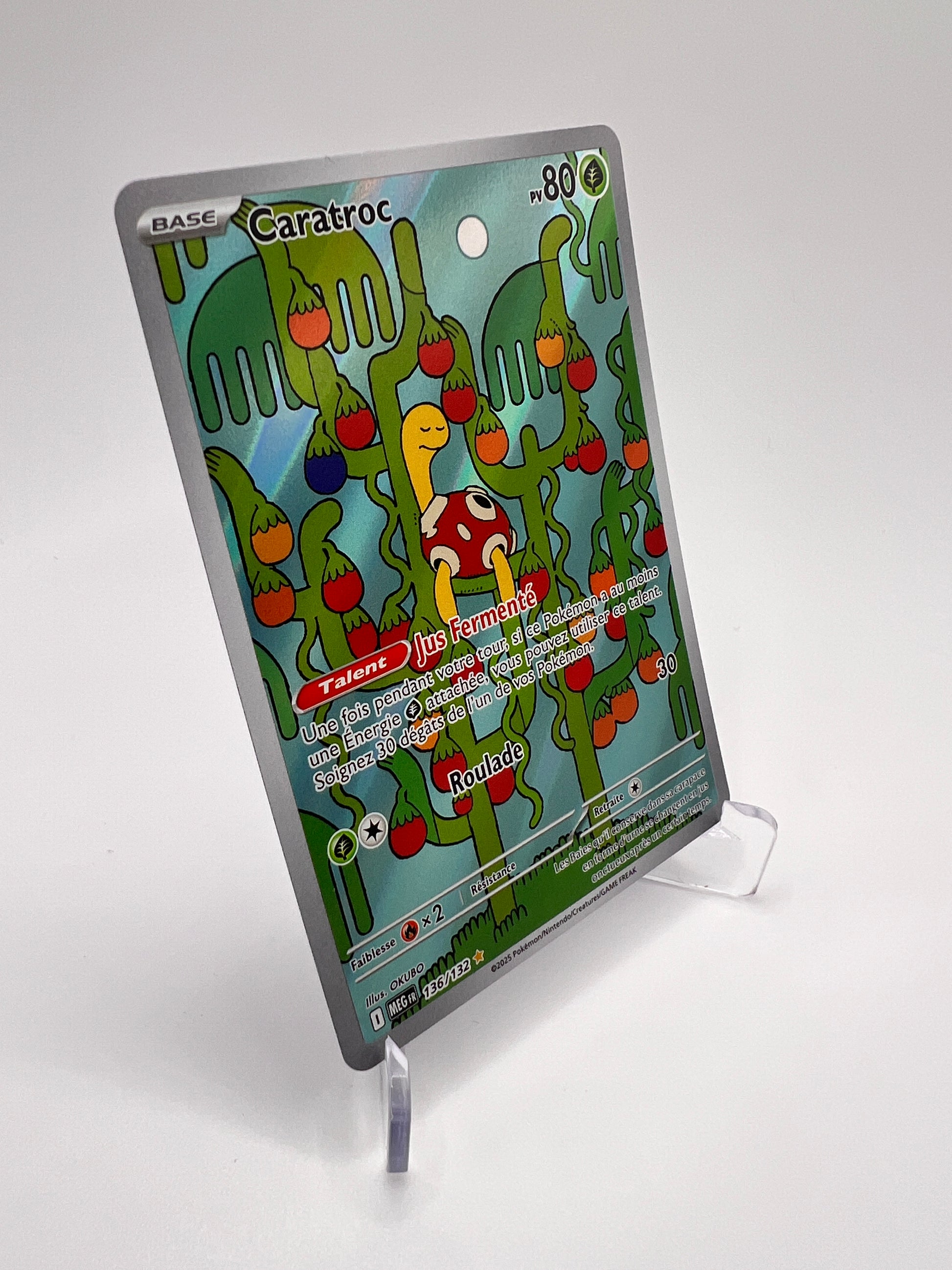 🐚 En état Near Mint, ce Caratroc 136/132 de la série Méga-Évolution séduit par son illustration pleine de détails et ses tons chaleureux typiques des sets japonais de cette génération. Une carte qui met en avant la nature défensive et singulière de ce Pokémon Insecte/Roche, rarement mis à l’honneur dans le TCG.