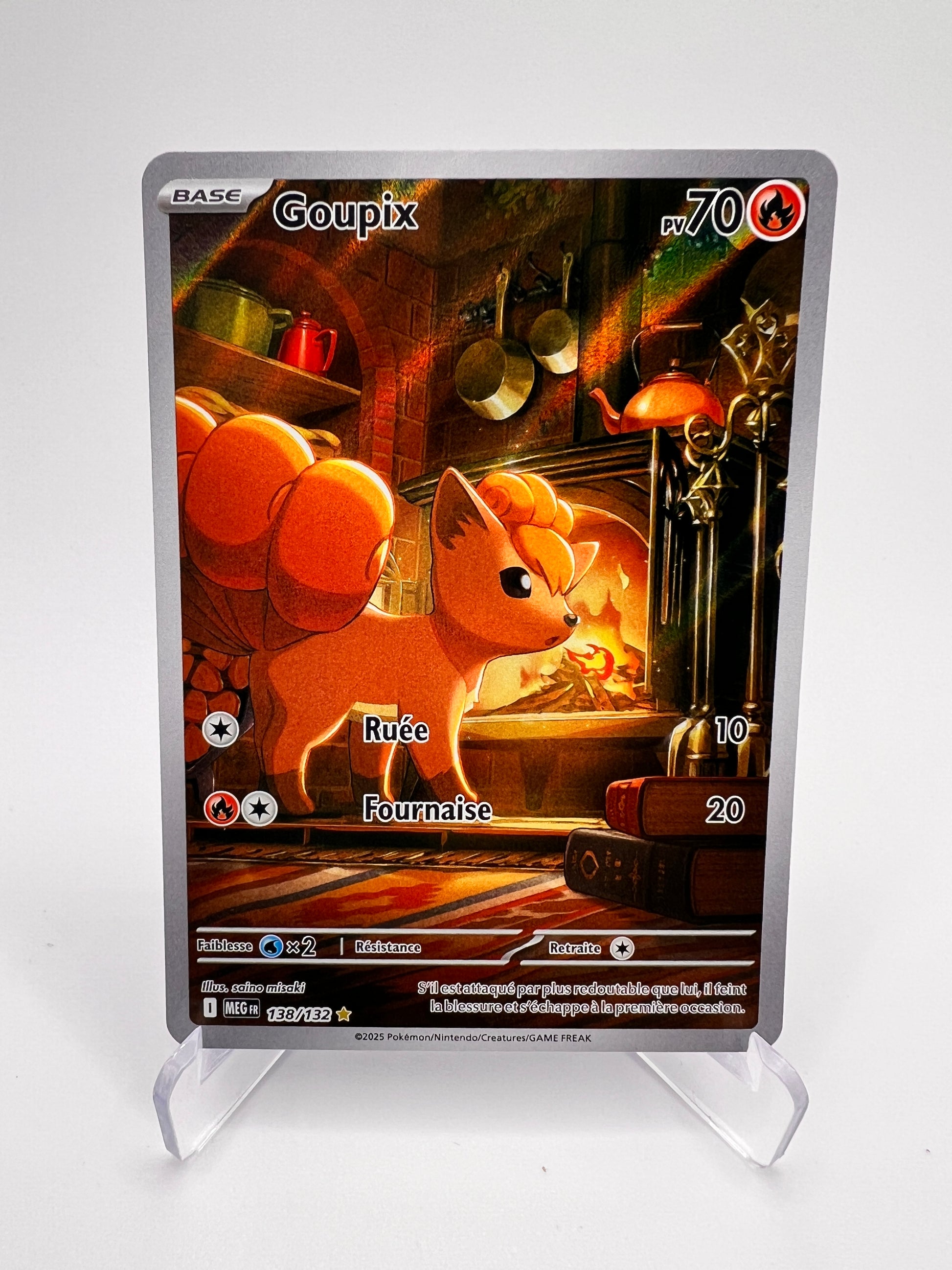 🔥 En superbe état Near Mint, ce Goupix 138/132 issu de la série Méga-Évolution séduit par son illustration lumineuse et son atmosphère chaleureuse. Le petit renard de Kanto y apparaît dans un style délicat et nostalgique, rappelant les plus belles cartes japonaises du bloc XY.