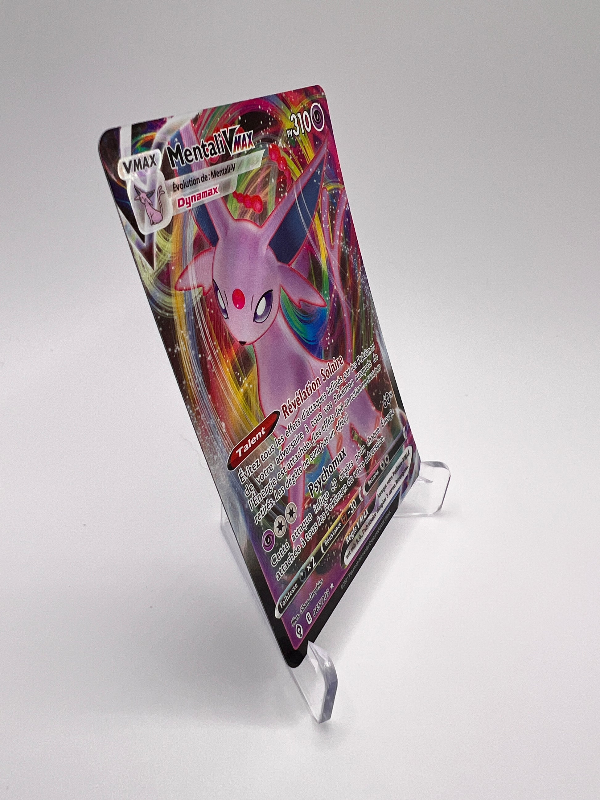 🌀 Ce Mentali VMAX 065/203 de la série Évolution Céleste incarne toute la finesse des Pokémon de type Psy. Son illustration spectaculaire, baignée de tons pastel, fait de cette carte un véritable bijou visuel. En état Excellent, elle présente quelques légères marques d’usure, mais conserve tout son éclat et sa présence en collection.