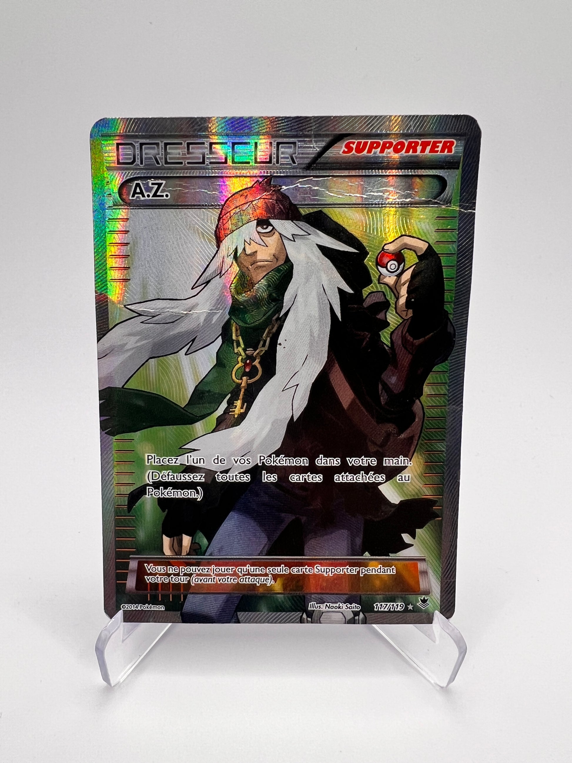 Carte Dresseur Ultra Rare issue de Vigueur Spectrale, extension marquante du bloc XY. A.Z. est une carte emblématique, très identifiable par son illustration et son importance dans la série. Exemplaire en état Mauvais, destiné avant tout à une collection budget / set binder.