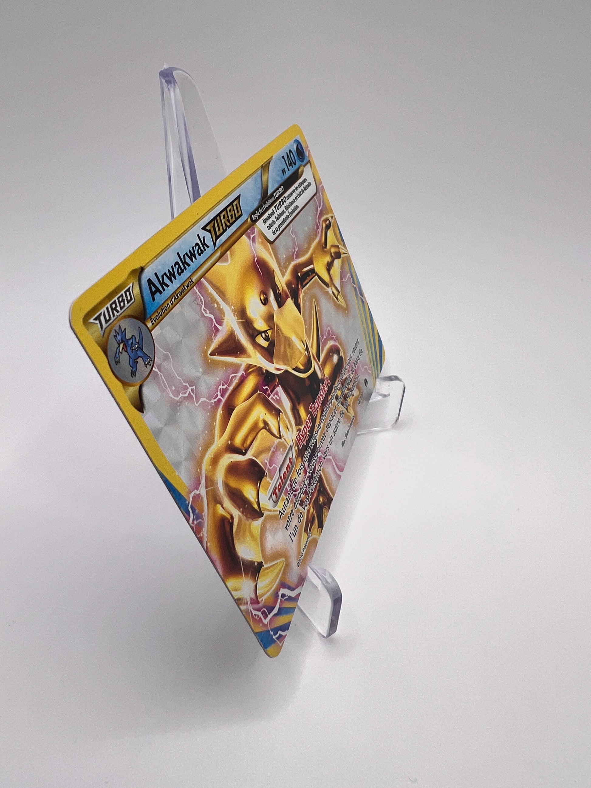 Akwakwak est l’évolution de Psykokwak, connu pour ses puissants pouvoirs psychiques déclenchés lorsqu’il souffre de migraines intenses. Cette version TURBO (BREAK) adopte le design doré horizontal caractéristique de la mécanique BREAK introduite dans l’ère XY. Une carte originale qui apporte une touche unique aux collections dédiées aux cartes TURBO.