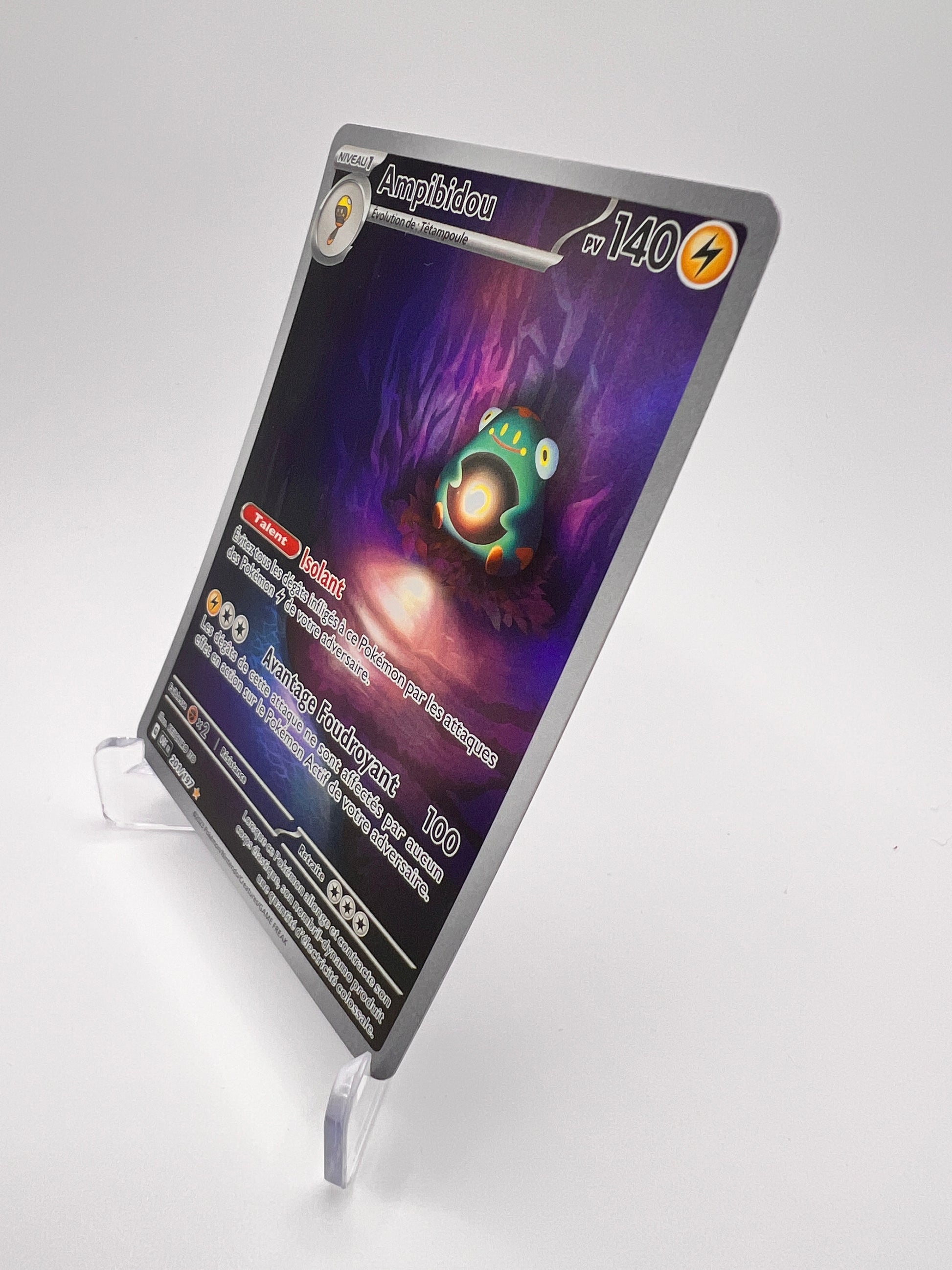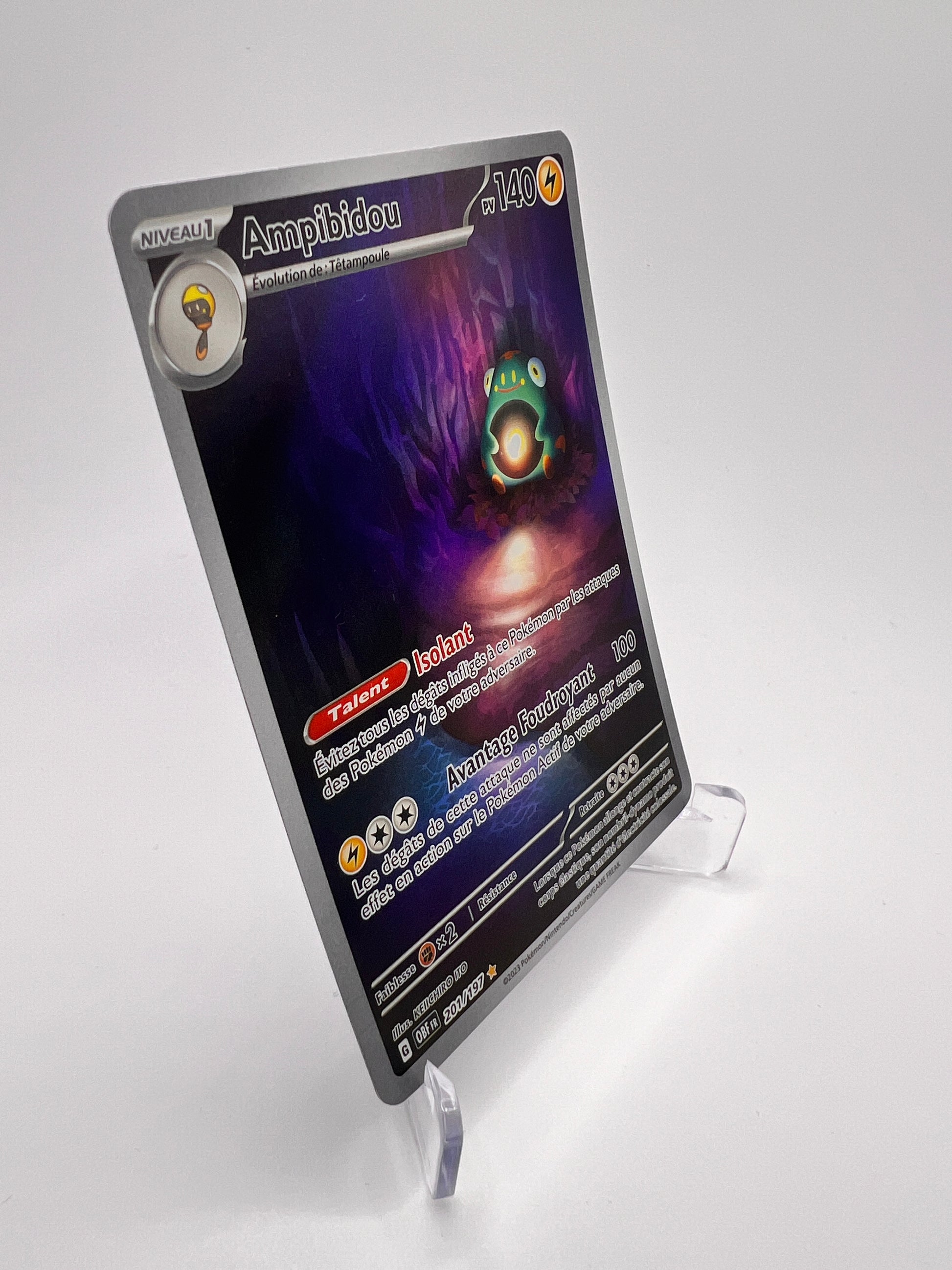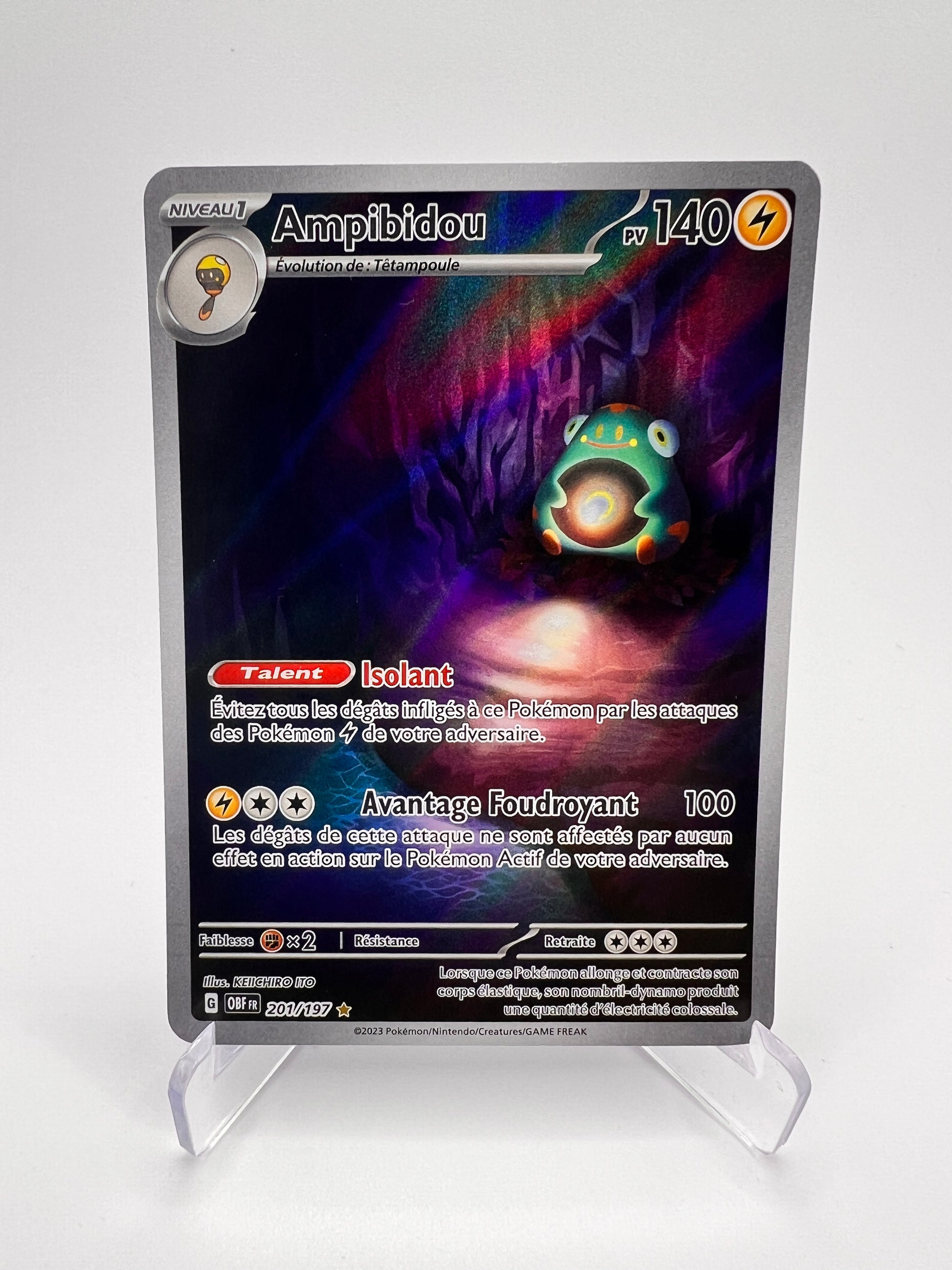 Une carte idéale pour compléter un set Flammes Obsidiennes ou enrichir une collection dédiée aux Pokémon Électrik. Avec son charme unique et sa finition haut de gamme, Ampibidou 201/097 fait partie des cartes appréciées de l’extension.