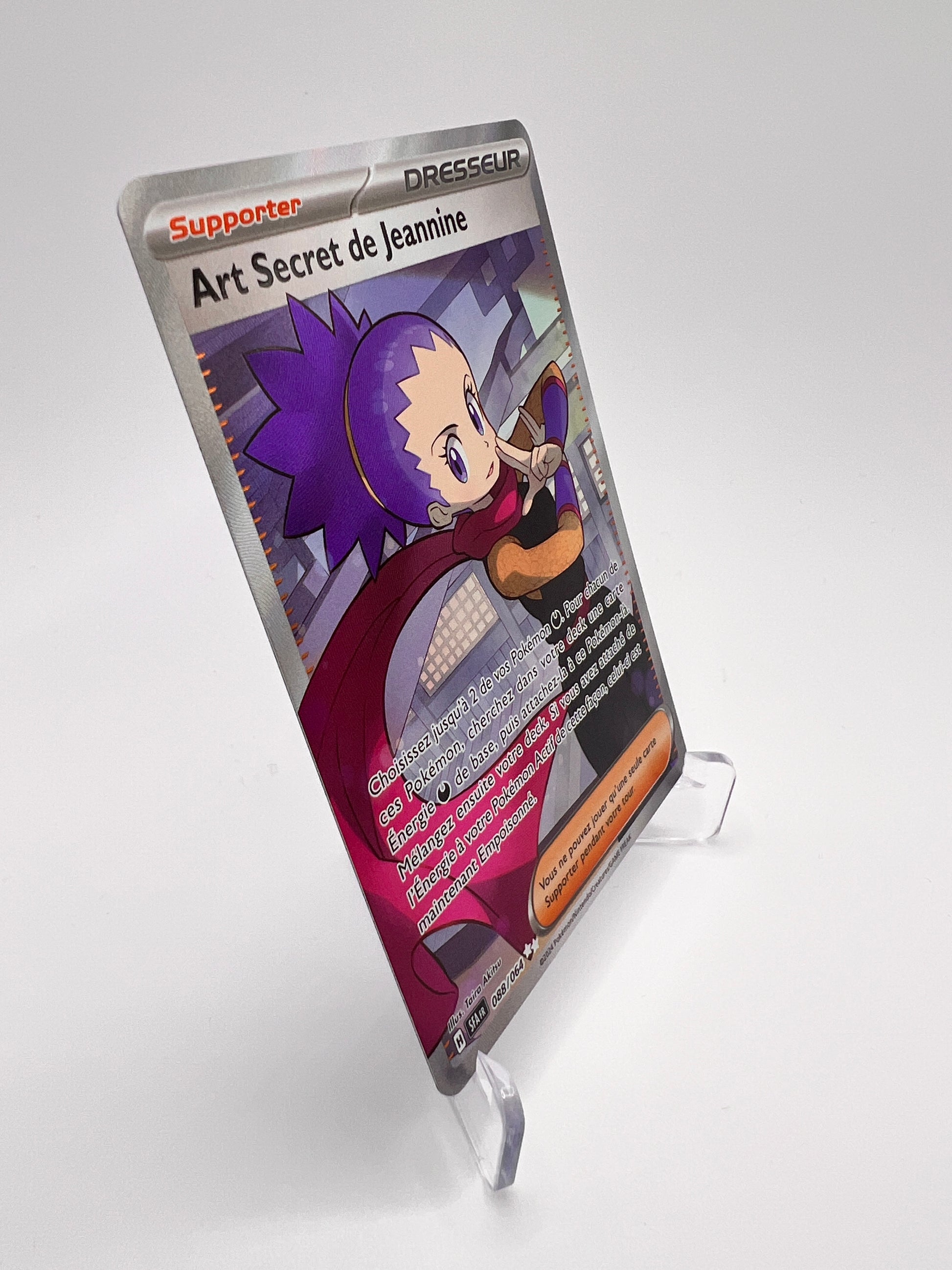 Découvrez Art Secret de Jeannine 088/064, une carte issue de l’extension Fable Nébuleuse, en état Near Mint. Cette carte Supporter Full Art, mettant en avant Jeannine, célèbre ninja et Dresseuse spécialisée dans les Pokémon de type Poison, est une pièce incontournable pour les collectionneurs et un atout stratégique pour les joueurs du JCC Pokémon.
