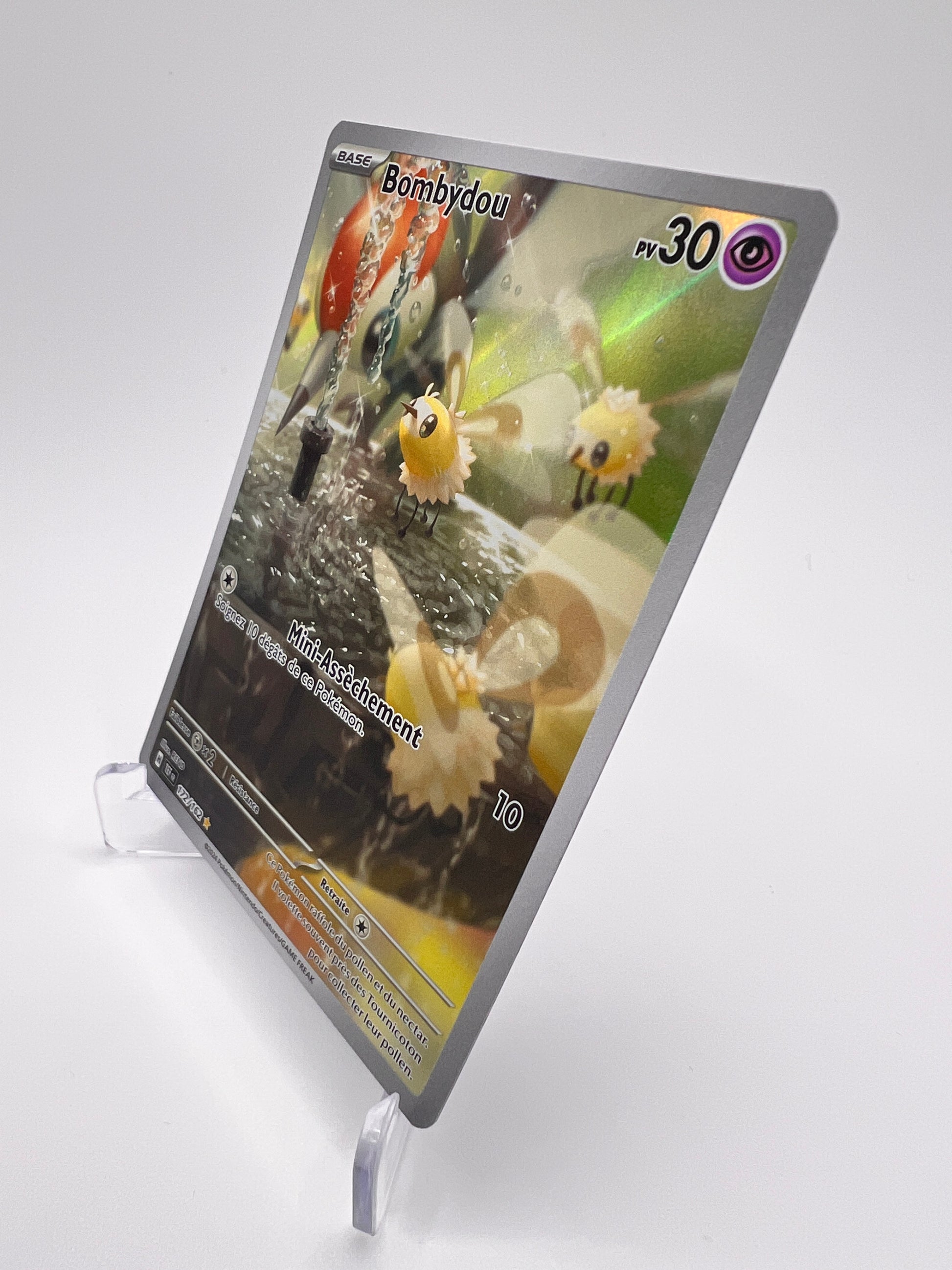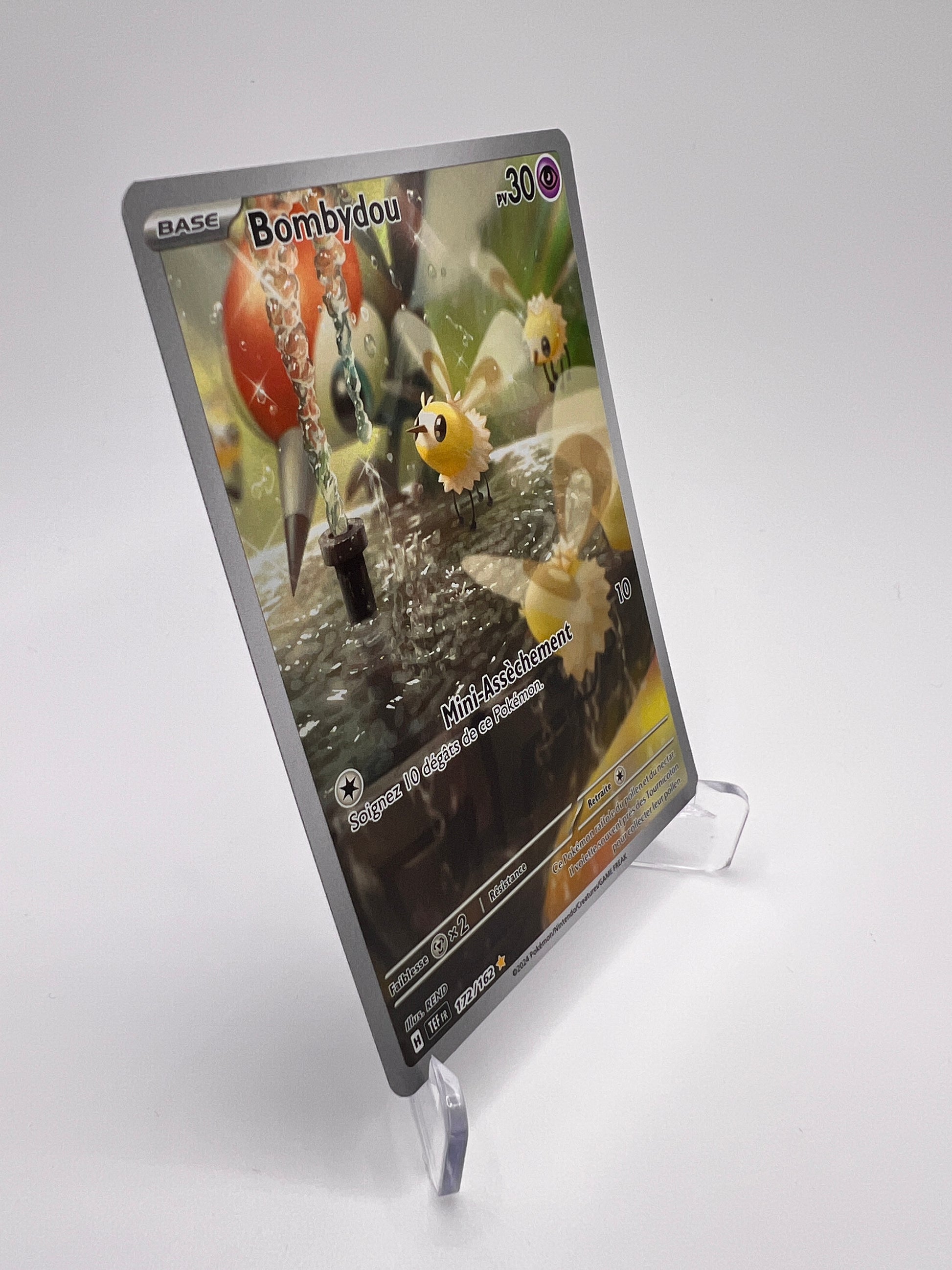 Petit mais remarquable, Bombydou se glisse dans l’extension Forces Temporelles avec une carte secrète pleine de charme. Sa taille minuscule ne l’empêche pas de briller avec une illustration colorée et scintillante, très appréciée des collectionneurs de Pokémon adorables et originaux 🌸✨