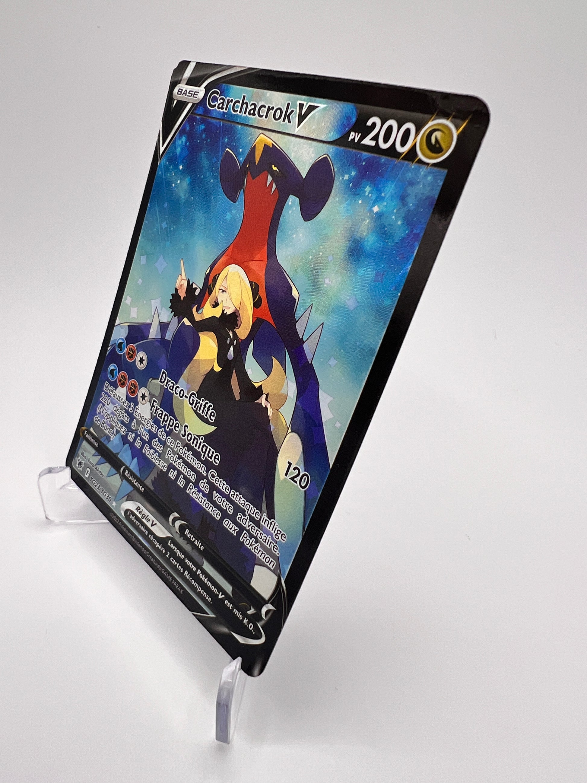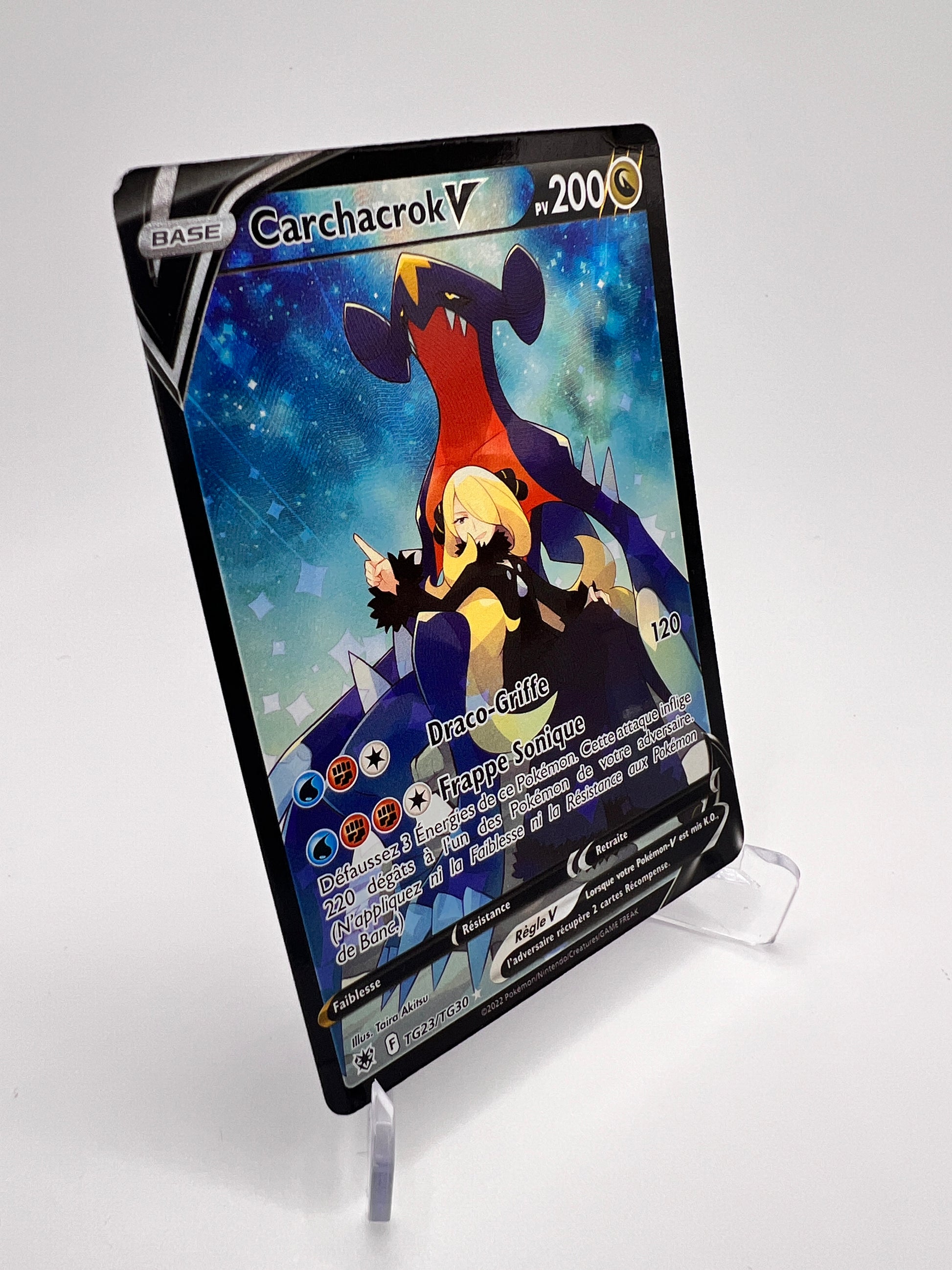 Préparez-vous à une vague de puissance avec Carchacrok V, dans sa version Trainer Gallery issue de l’extension Astres Radieux ! Accompagné de Cynthia, cette illustration saisissante met en avant le lien fort entre dresseur et Pokémon, dans un design dynamique et prestigieux 🐉👑