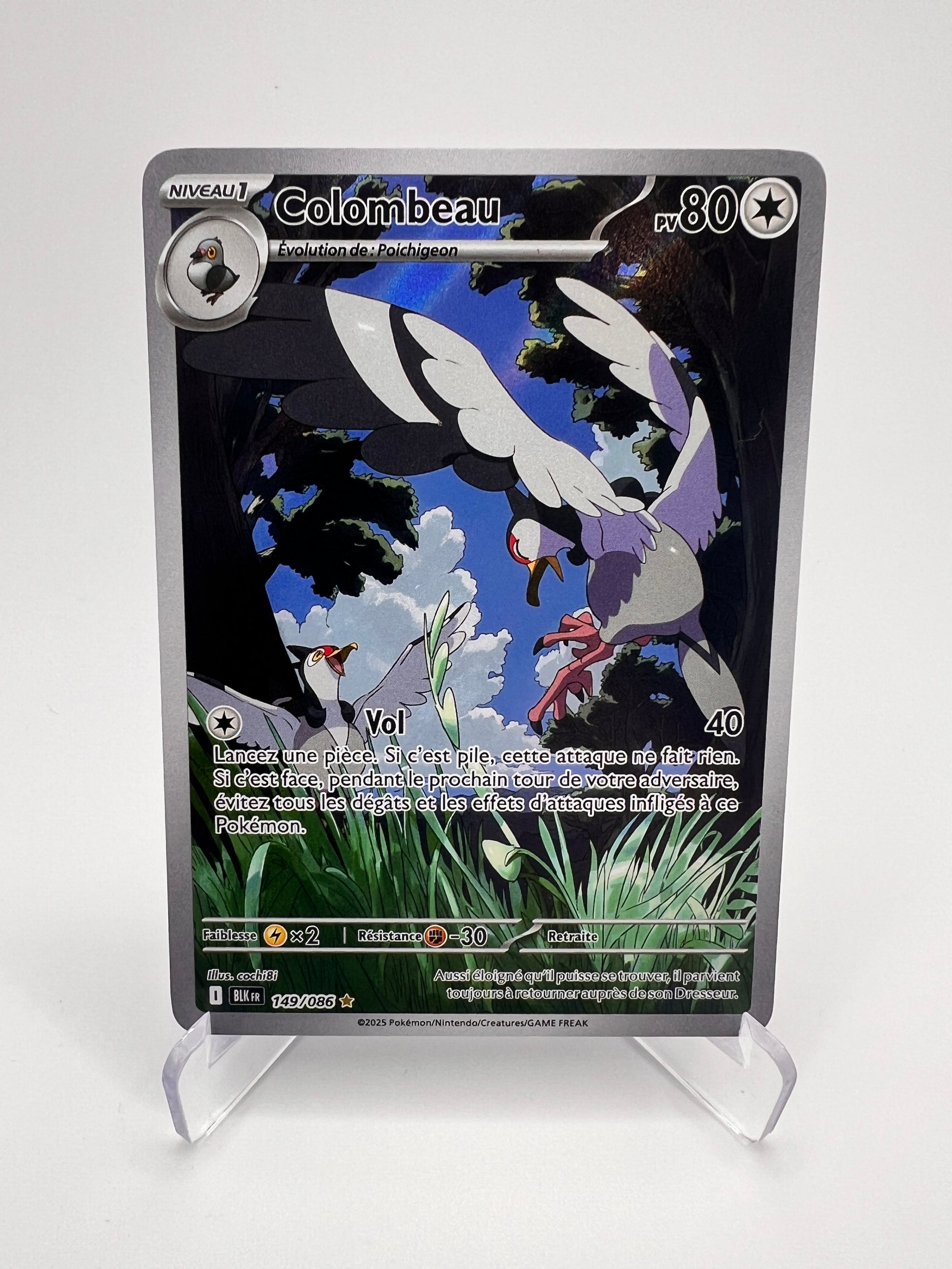 Avec son plumage éclatant et son vol élégant, Colombeau illumine cette version secrète de la série Foudre Noire. Son illustration délicate et poétique en fait une carte parfaite pour les collectionneurs à la recherche de douceur et de légèreté dans leur collection. 🌤️✨