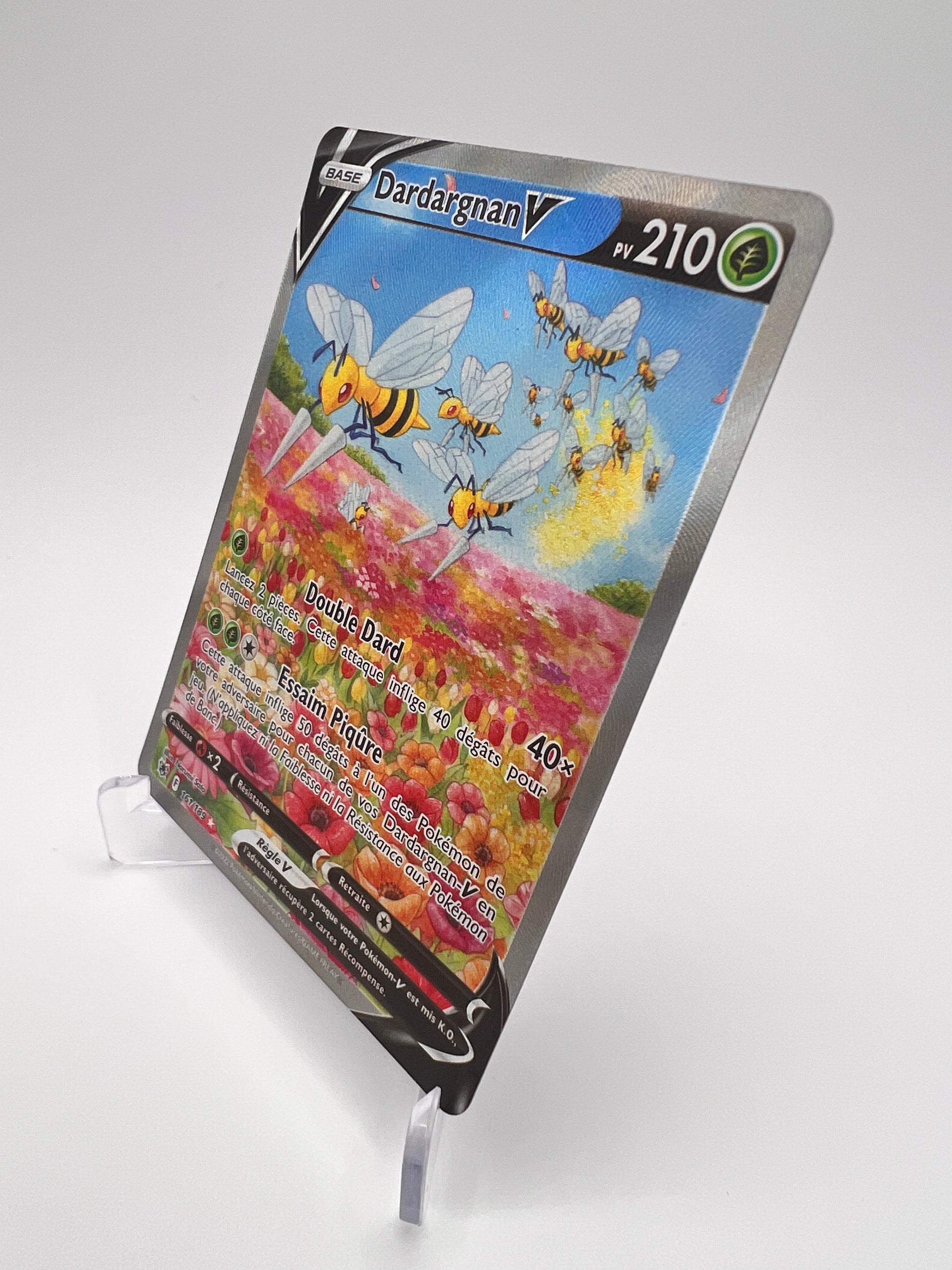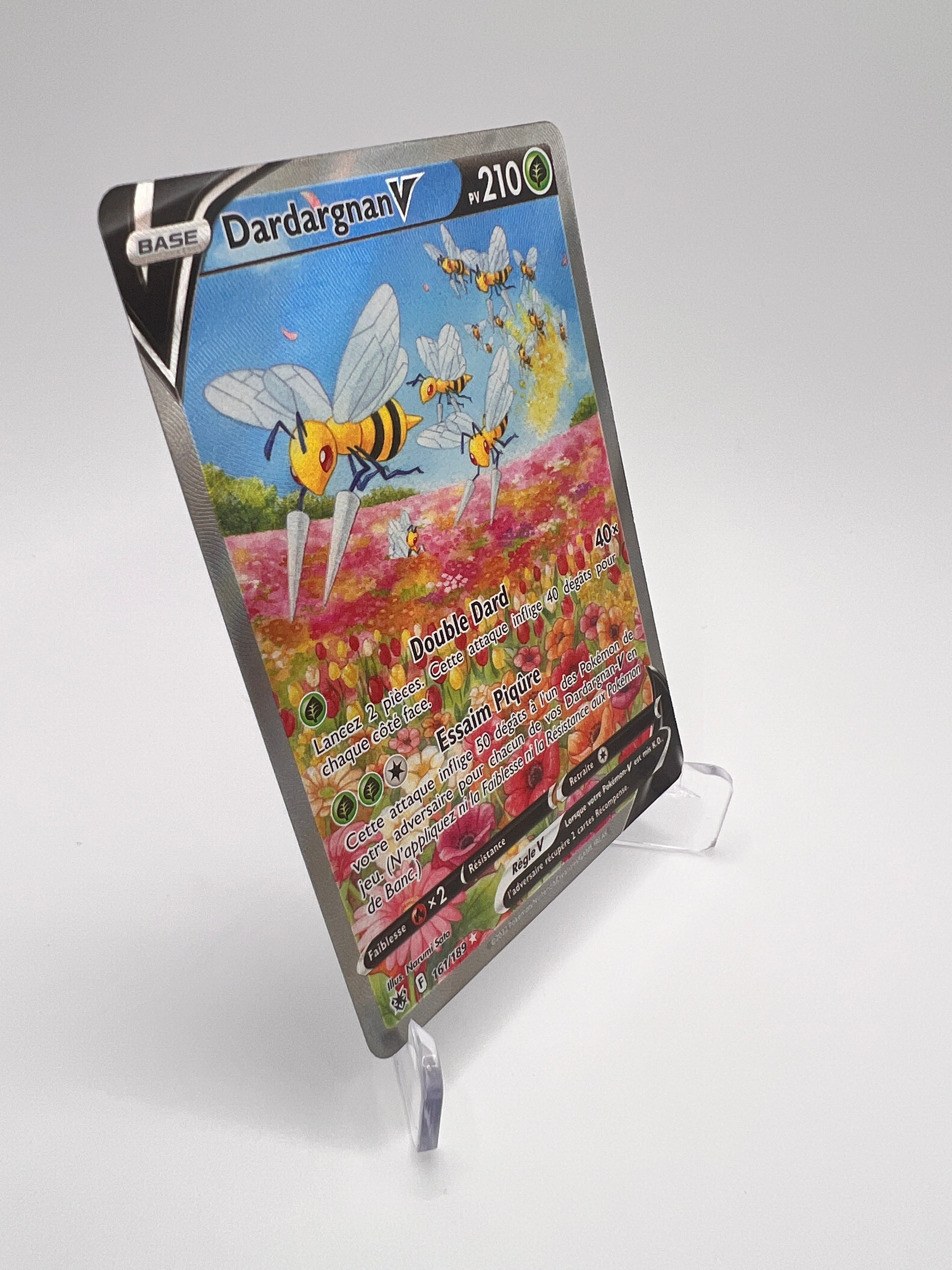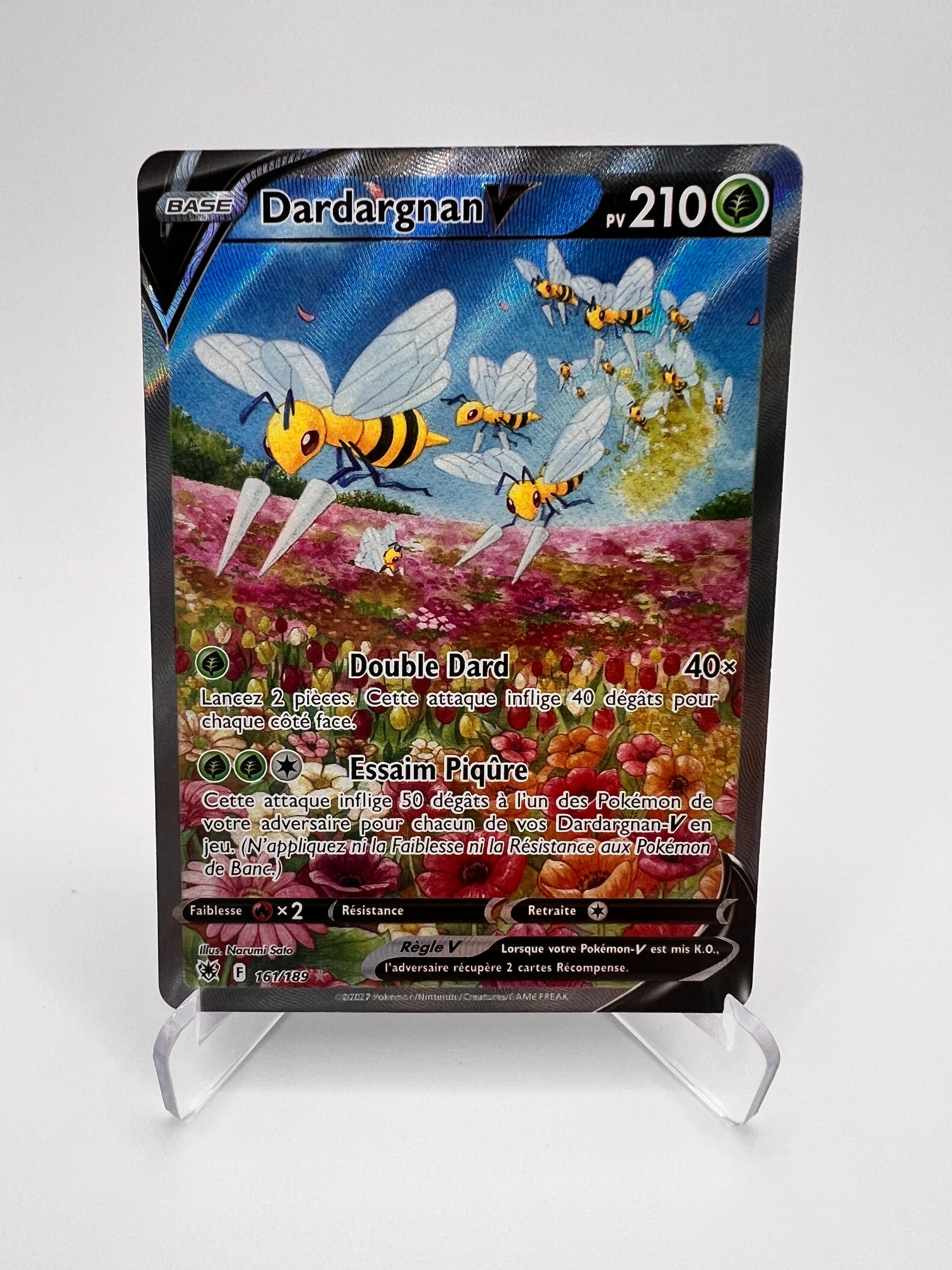 🐝 En très bel état Near Mint, ce Dardagnan V 161/189 issu de la série Astres Radieux est une carte qui respire la puissance et la vitesse. Son illustration dynamique capture à la perfection l’énergie du Pokémon Insecte dans un style éclatant typique du bloc Épée & Bouclier.