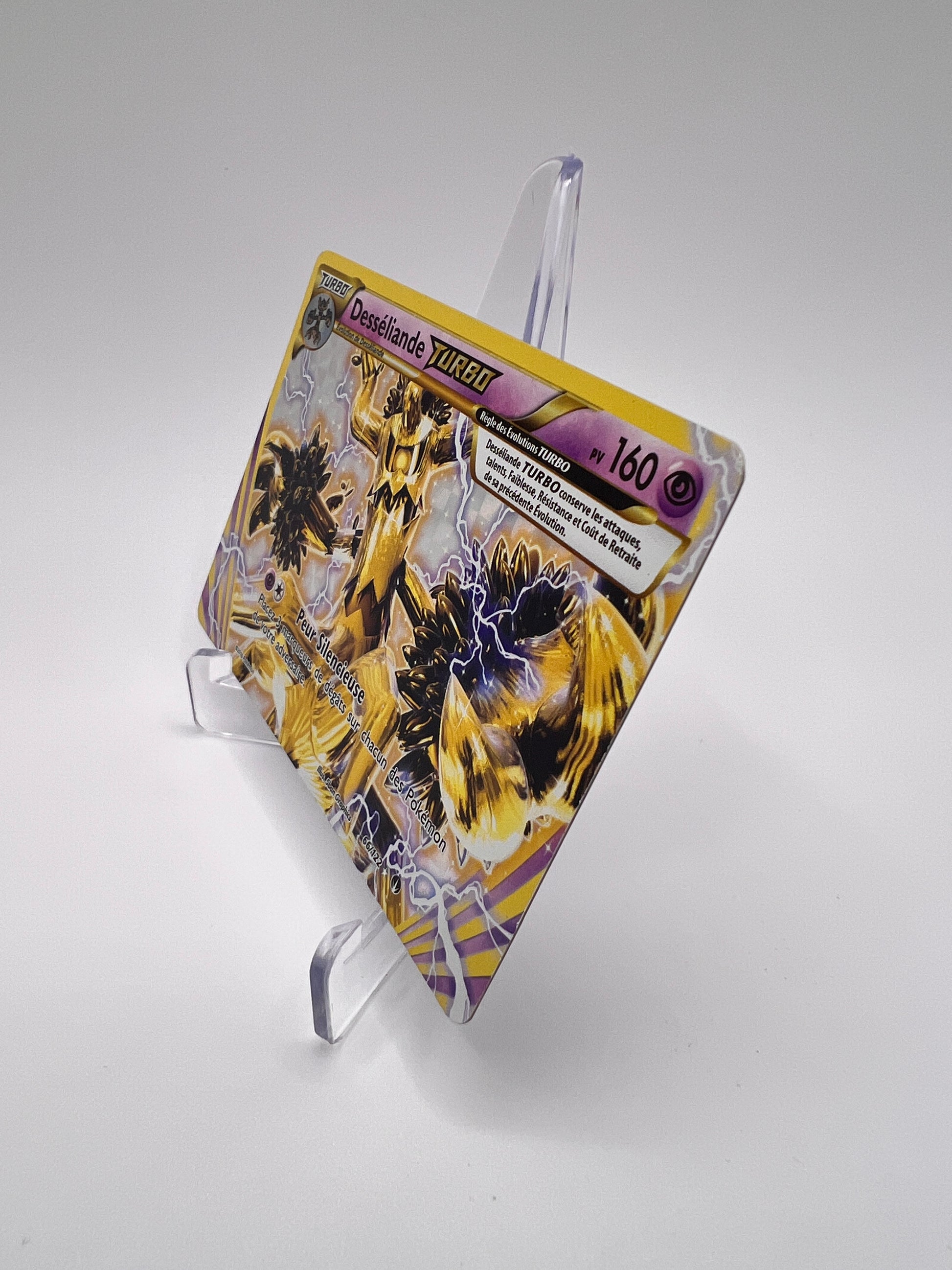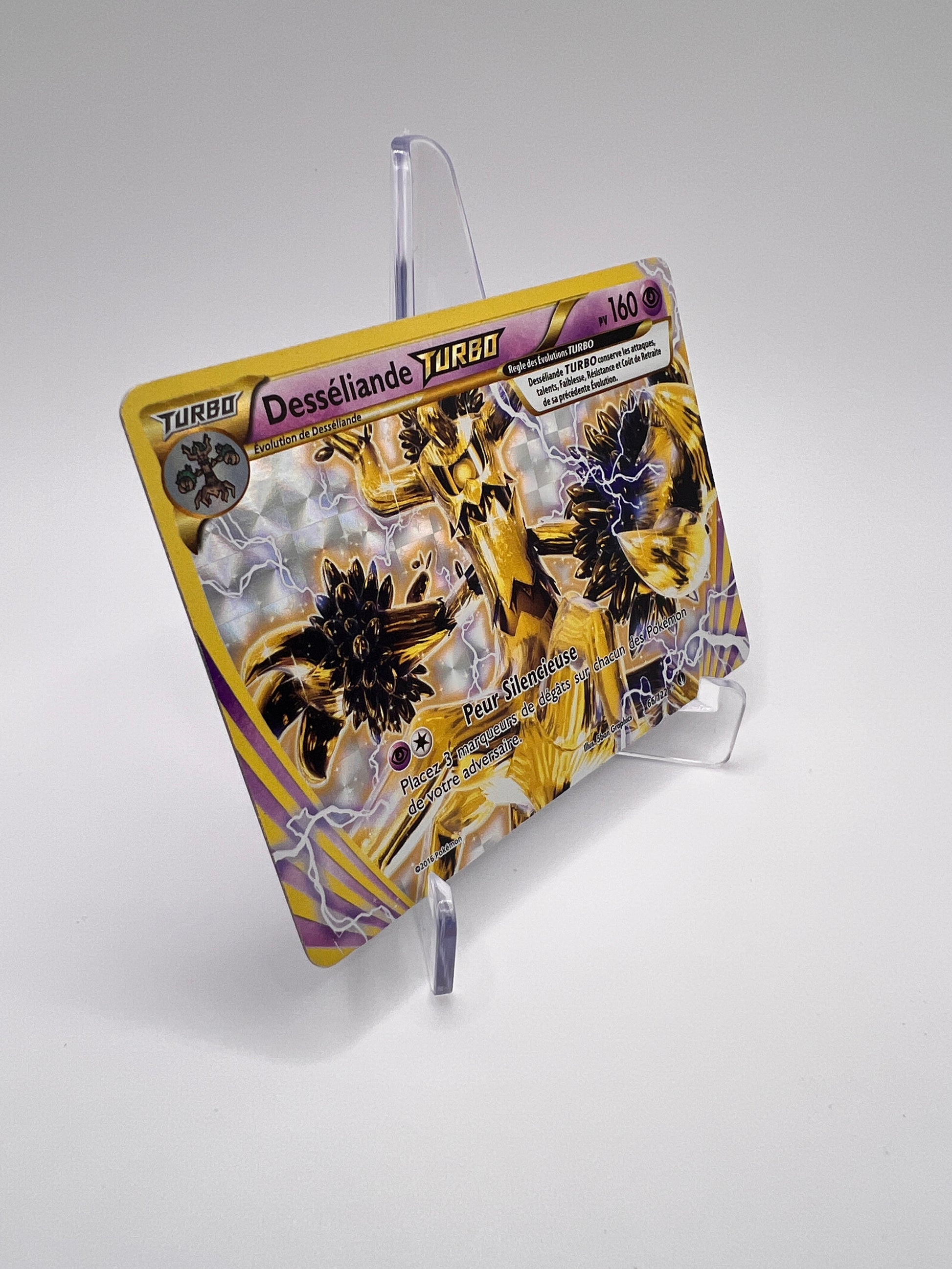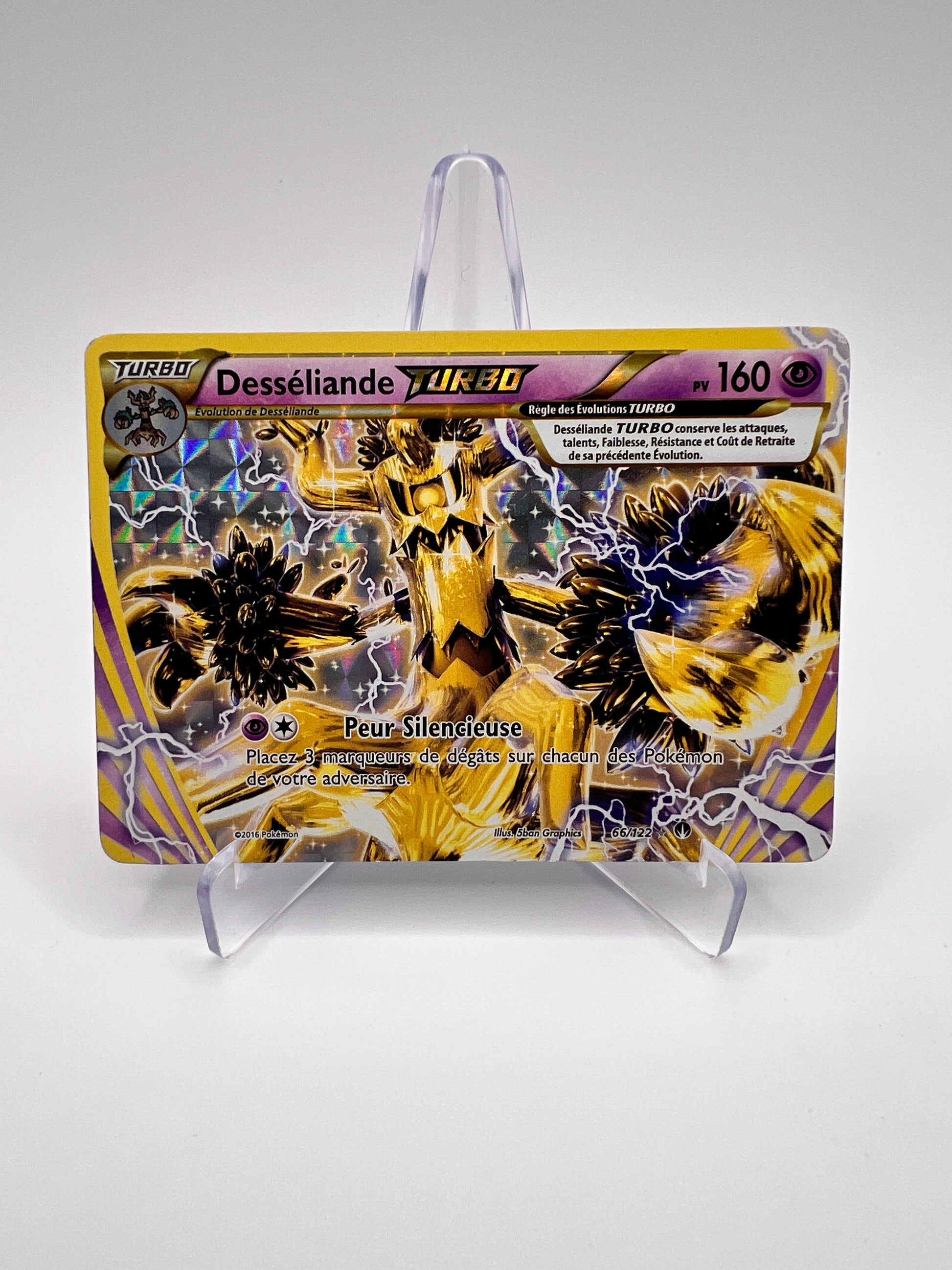 Desséliande est un Pokémon Spectre/Plante au design inquiétant inspiré des arbres hantés. Cette version TURBO (BREAK) adopte le style doré horizontal caractéristique de la mécanique BREAK introduite dans l’ère XY. Une carte originale et recherchée par les collectionneurs qui apprécient les cartes TURBO et les Pokémon spectres.