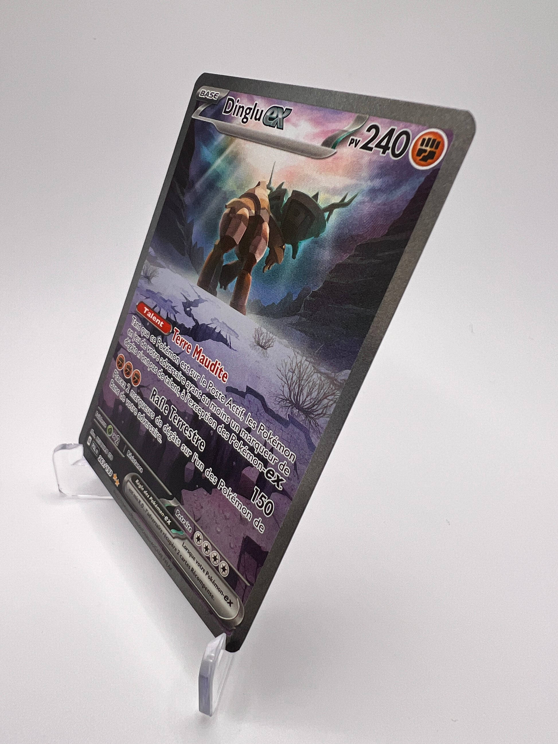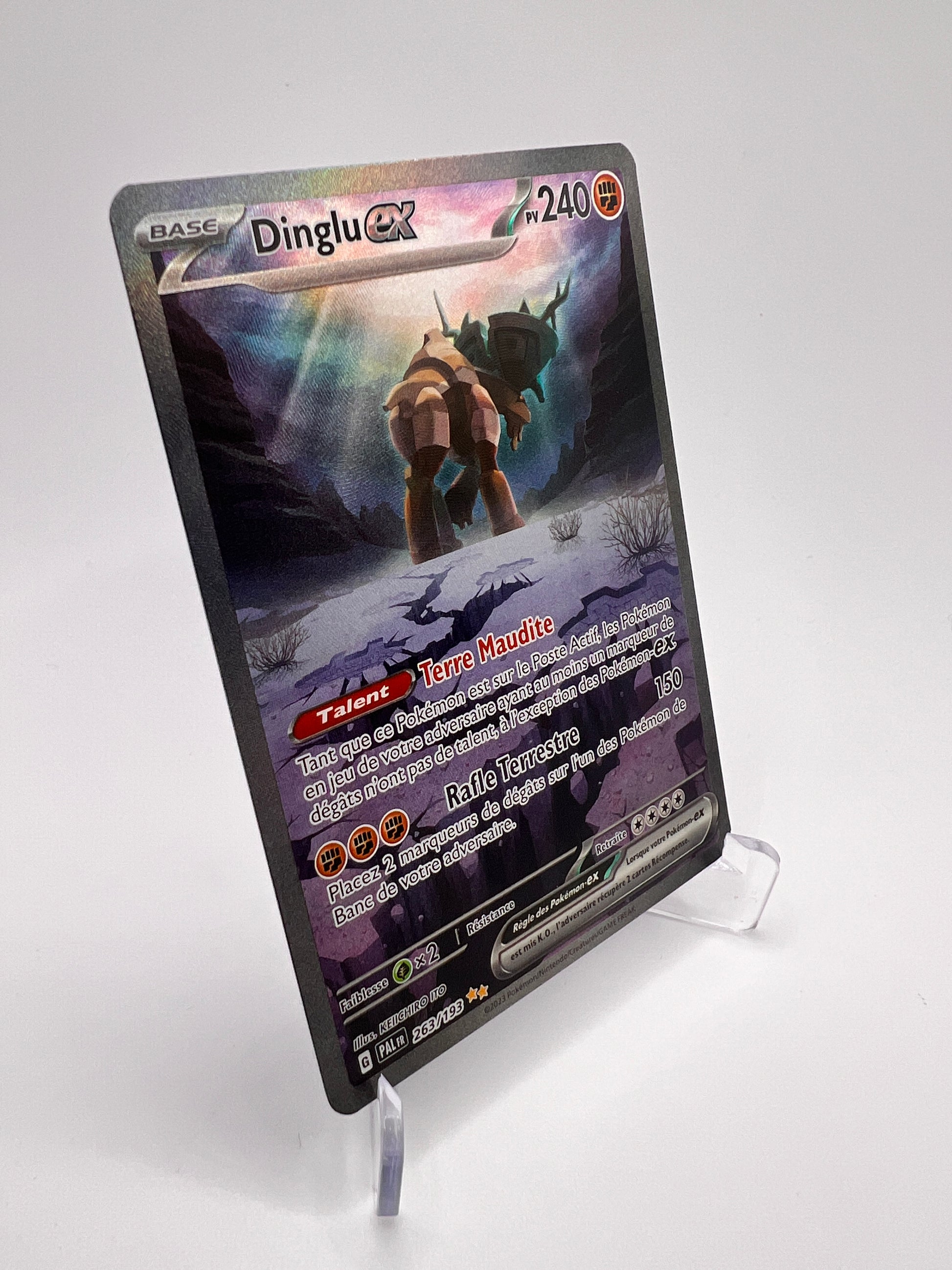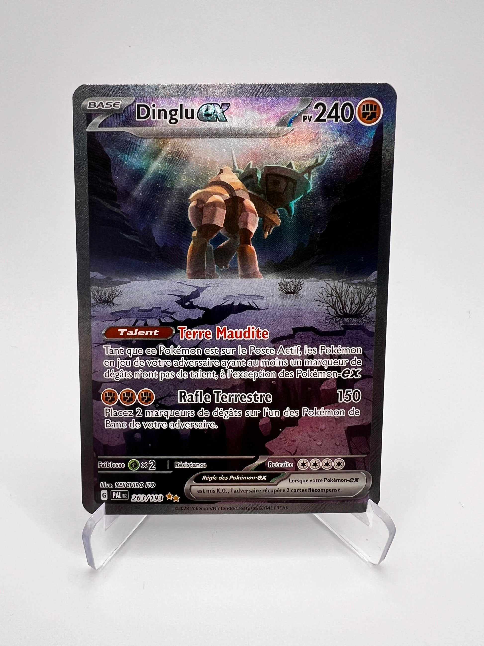 🗿 Dinglu EX – Le poids du sacrifice dans une carte légendaire ! Issu de la série Évolutions à Paldea, Dinglu EX s’impose dans une version secrète au visuel monumental. Inspiré de la mythologie chinoise et enveloppé d’une aura mystique, ce Pokémon légendaire de type Ténèbres incarne la puissance brute et l’équilibre du chaos. Une carte aussi esthétique que redoutée. 🌓🔗