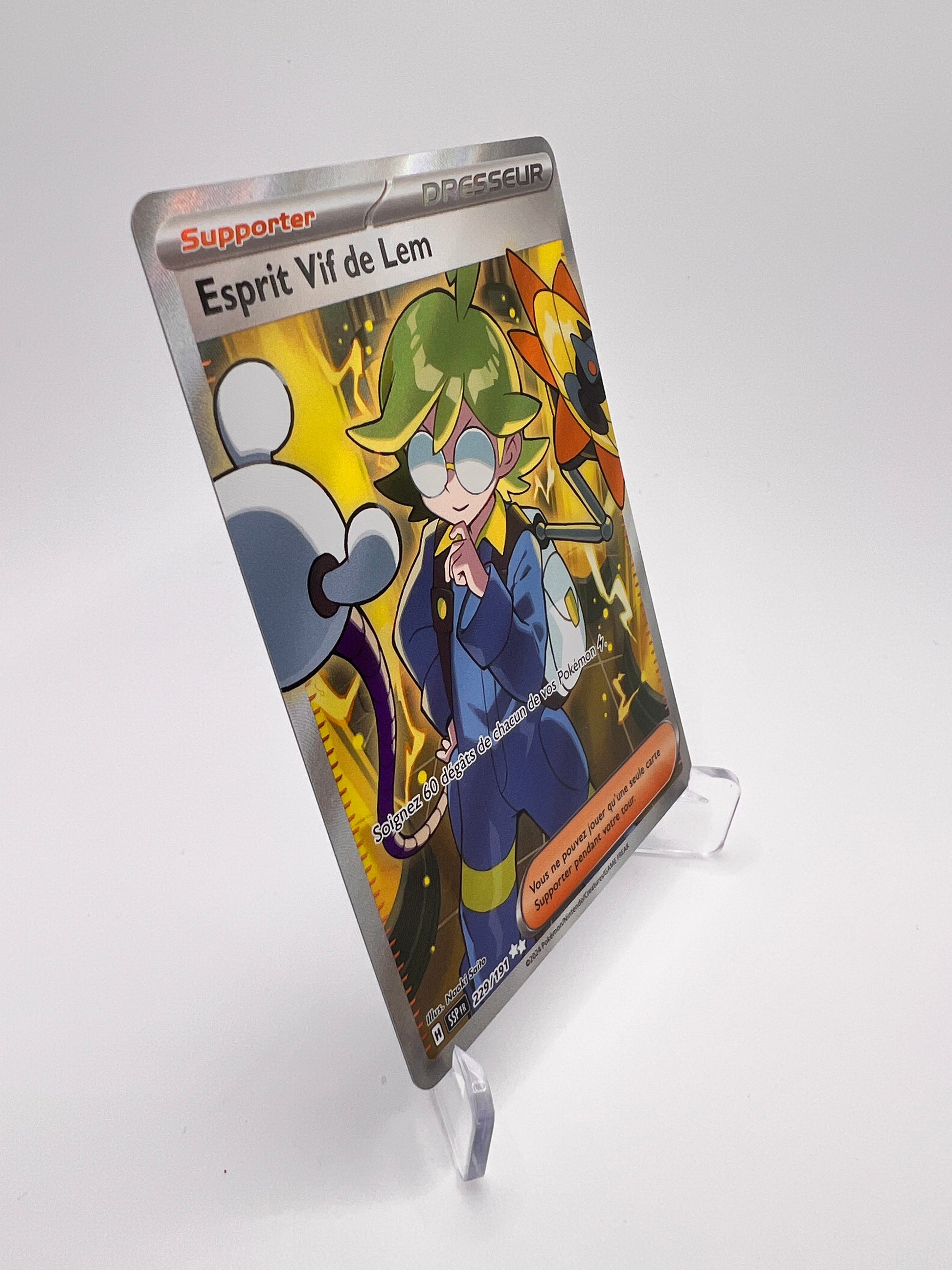 Découvrez Esprit Vif de Lem 229/191, une carte issue de l’extension Étincelles Déferlantes, en état Near Mint. Ce Dresseur Supporter Full Art, mettant en avant Lem, le génie passionné d’Électricité et Champion d’Arène de l’univers Pokémon, est une carte convoitée pour son design soigné et son impact stratégique.