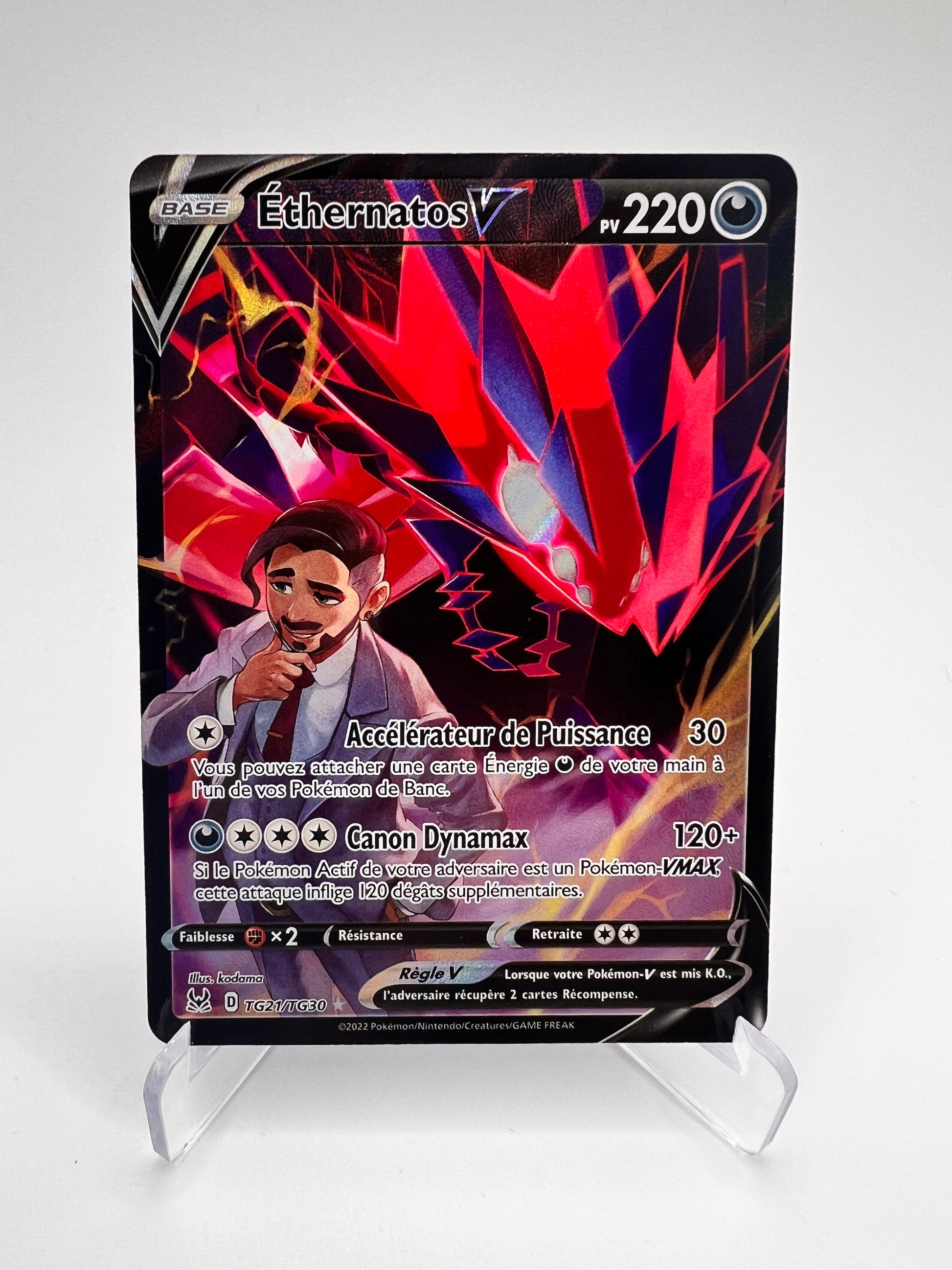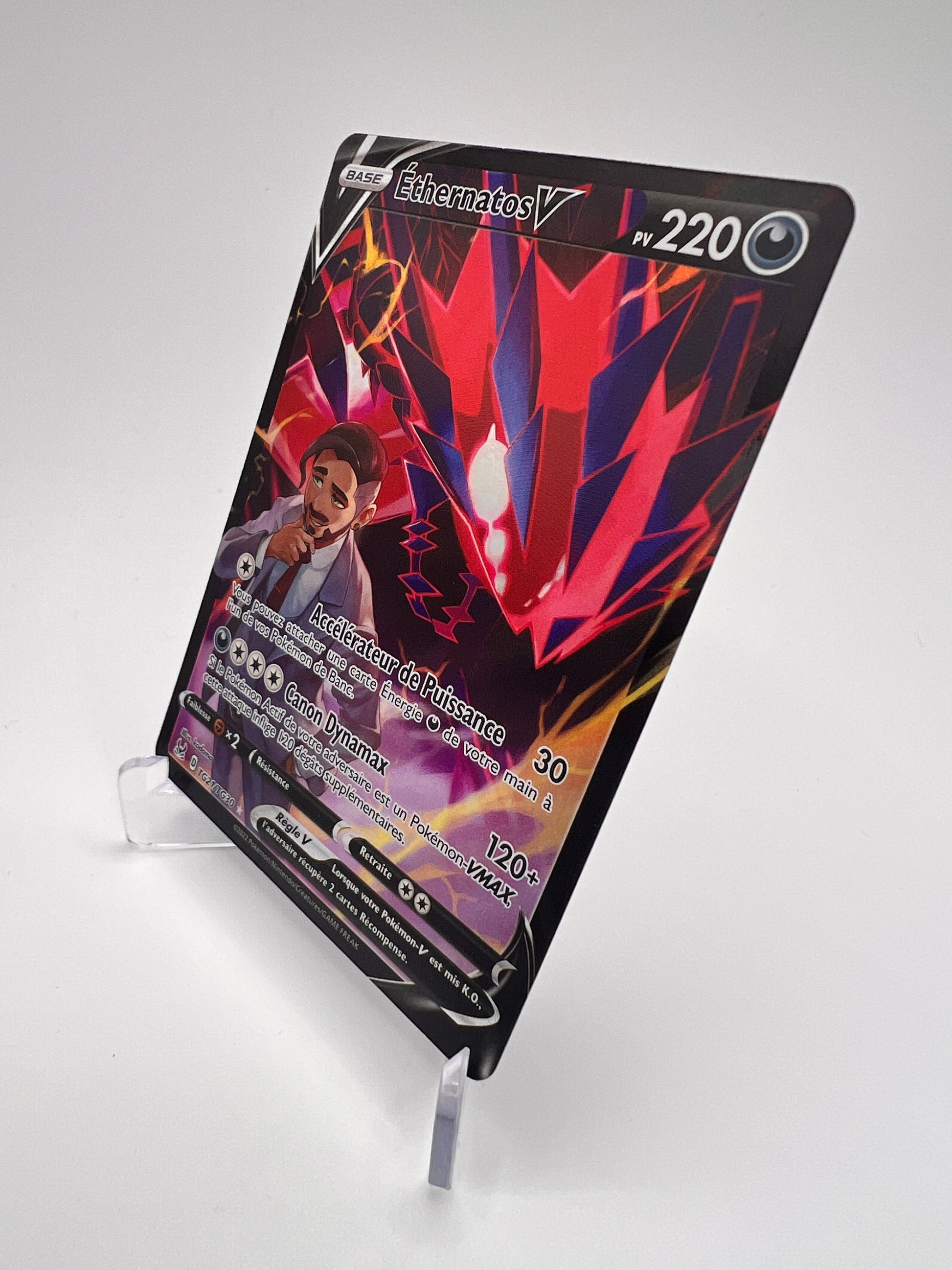 Avec son design ténébreux et son illustration alternative Galerie de Dresseur (Trainer Gallery), Éthernatos Vn°TG21/TG30 brille dans l’extension Origine Perdue. Aux côtés de la mystérieuse Rose, ce Pokémon légendaire impose son style sombre et démesuré. Une carte redoutée en jeu… et adorée en collection ! 🔥🖤