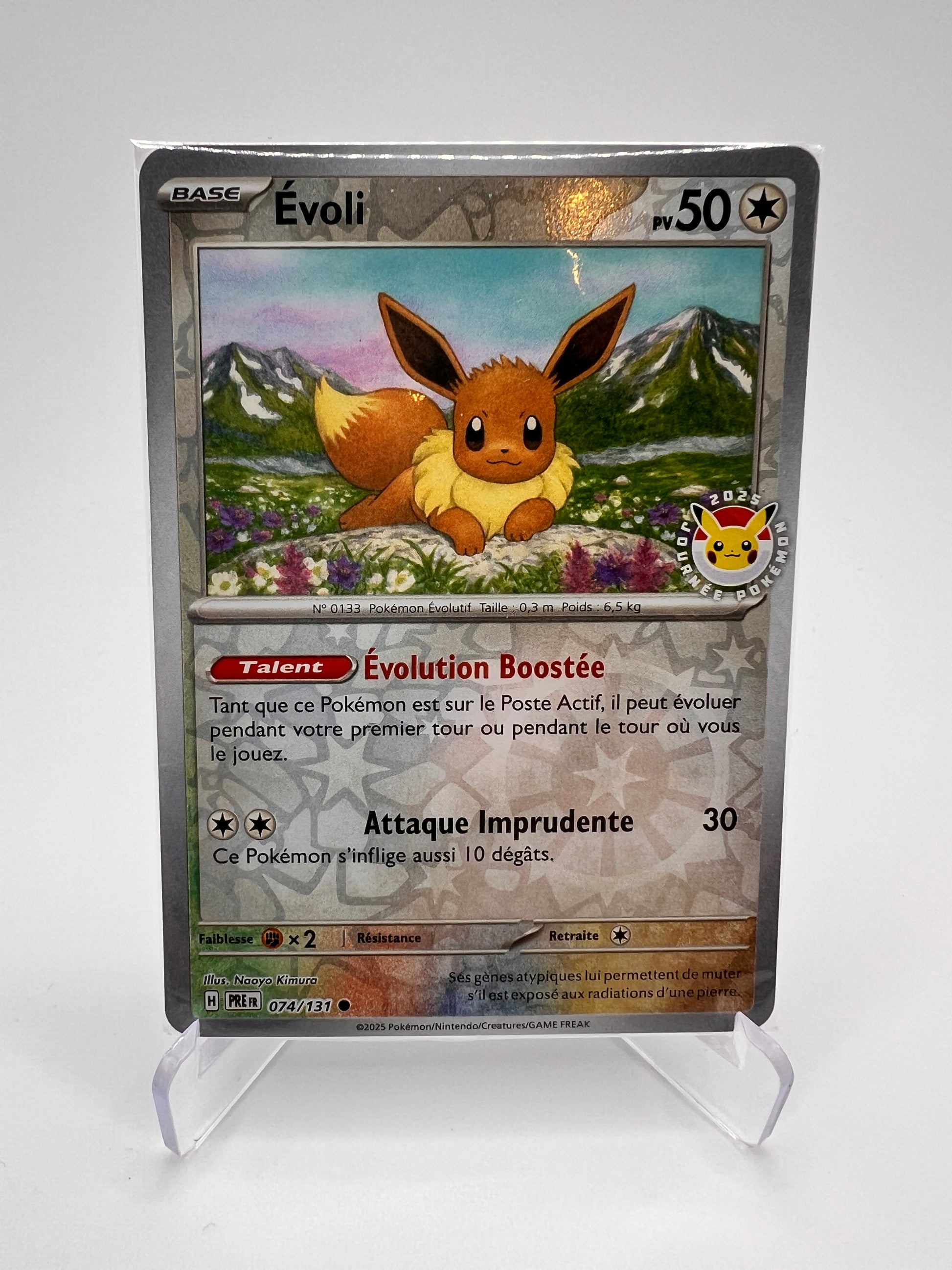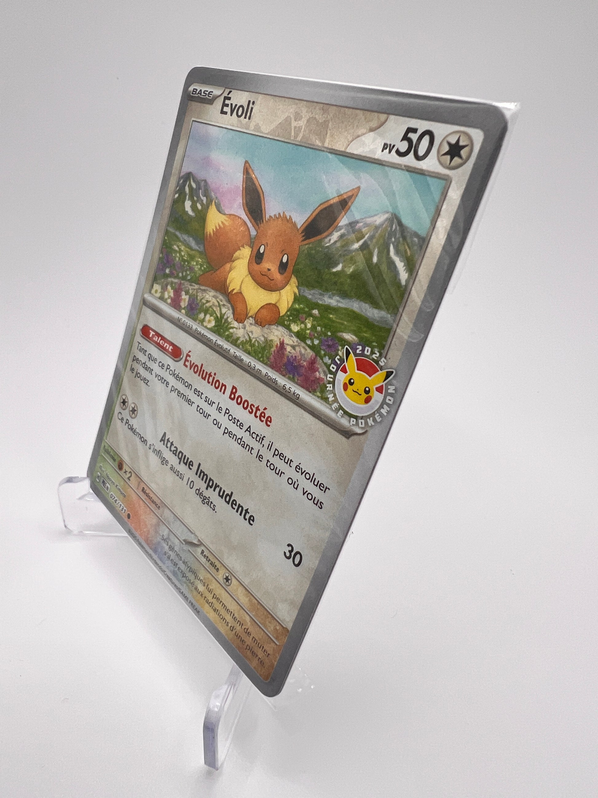 Impossible de résister à cette version scellée du célèbre Évoli, carte n°074/131 issue de l’extension Évolutions Prismatique avec son tampon exclusif ! Un must-have pour les fans d’Évoli et les collectionneurs de cartes promos soignées 💖🦊
