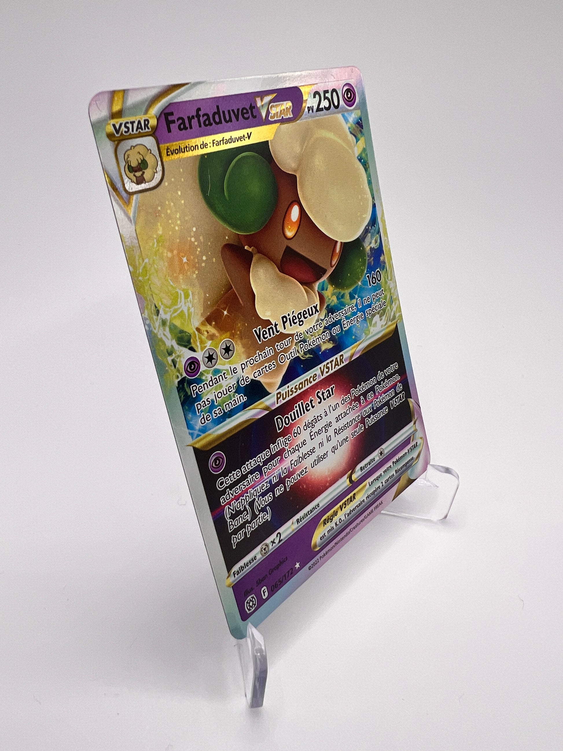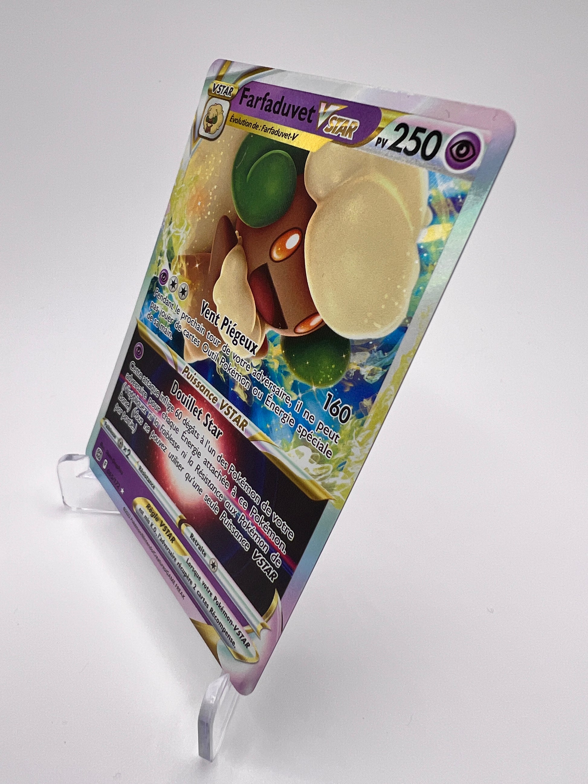 Apportez une touche de légèreté stratégique à votre collection avec Farfaduvet VSTAR, issu de l’extension Stars Étincelantes. Ce Pokémon Plante espiègle et agile se révèle redoutable en combat grâce à ses capacités tactiques et son design tout en finesse 🍃✨