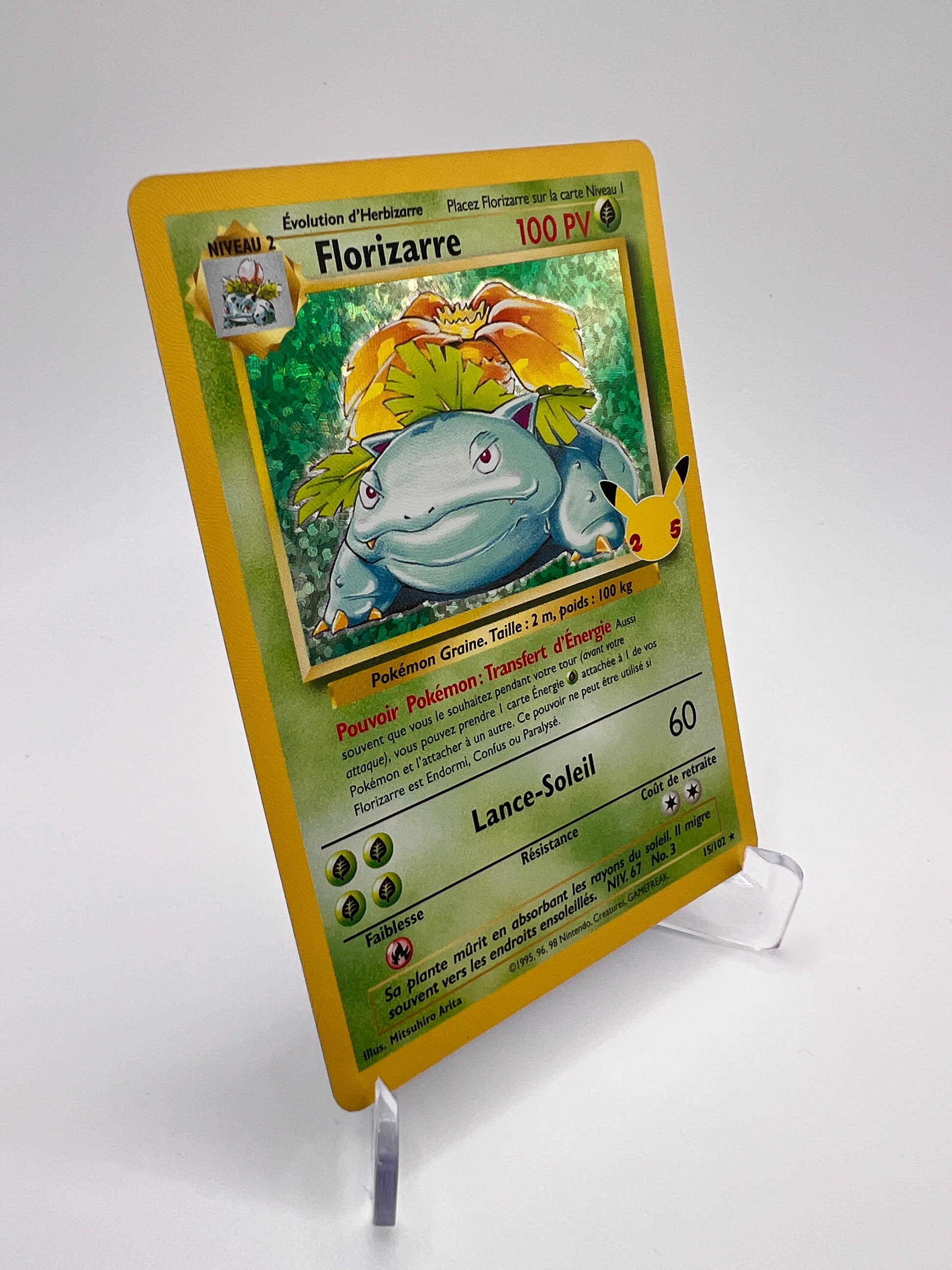 🔹 Série : Célébrations 🔹 Numérotation : 15/102 🔹 État : Near Mint – Superbe qualité visuelle 🔹 Pokémon de type Plante, évolué de Herbizarre, symbole de puissance et de stratégie