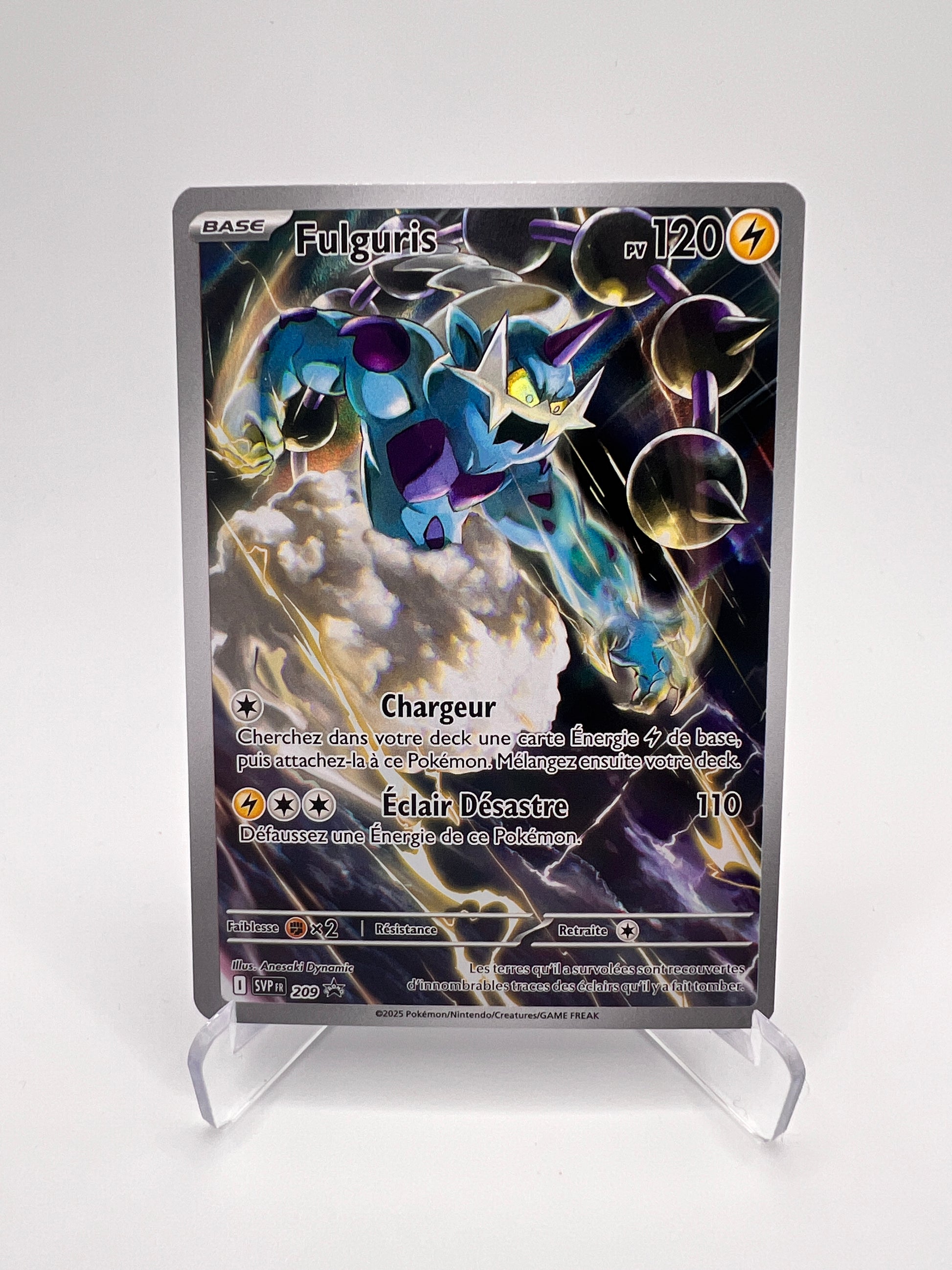 Promo SVP qui envoie direct. Fulguris, légendaire électrique au style agressif, apporte une vraie énergie à un binder promos SV ou une collec légendaires. Carte clean, impact immédiat.