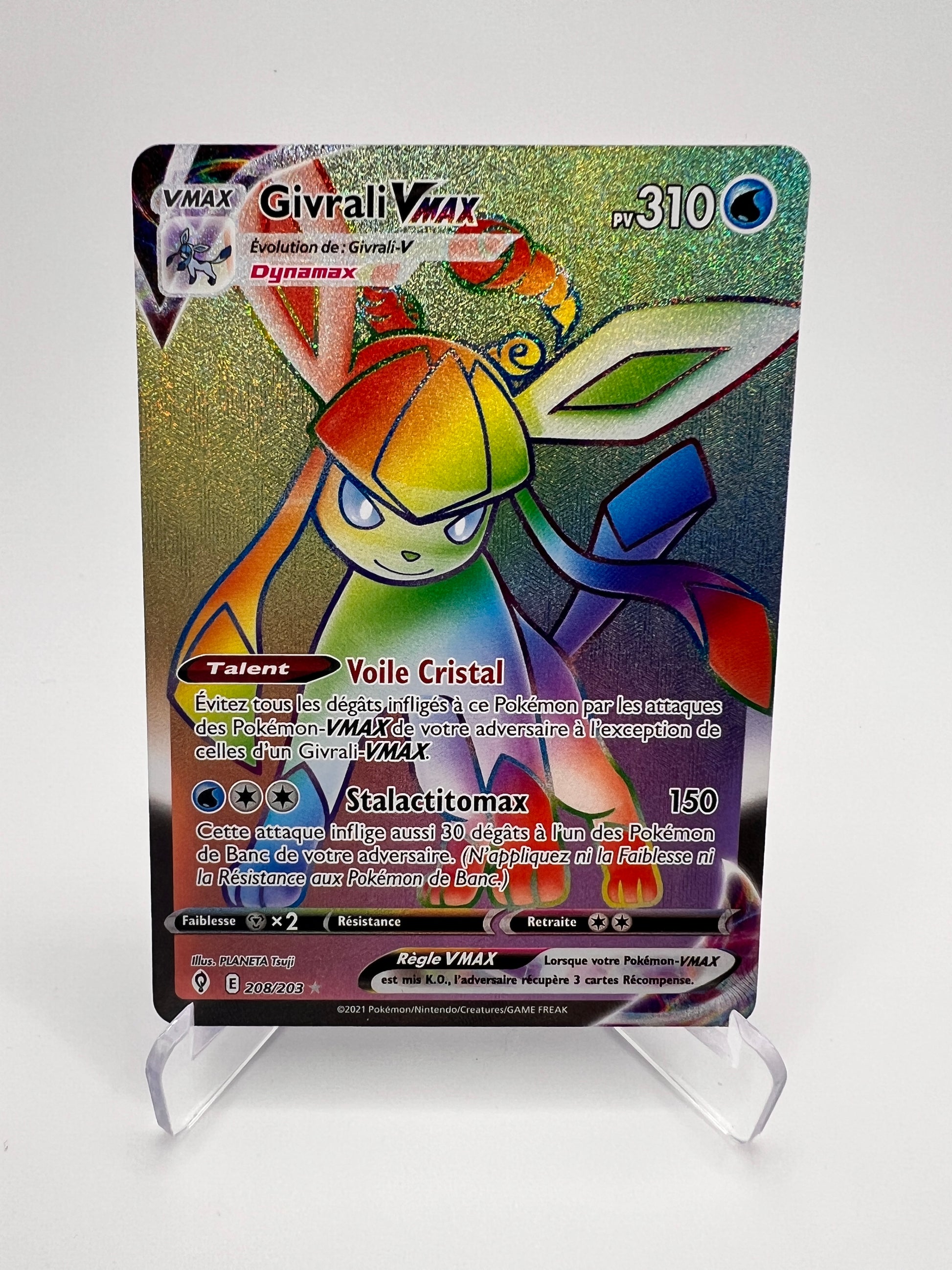 Plongez dans un monde de glace et d’élégance avec Givrali VMAX, carte secrète 208/203 de l’extension Évolution Céleste. Cette évolution majestueuse d’Évoli séduit autant par sa puissance que par la finesse de son illustration. Une full art VMAX prisée des fans et collectionneurs 🌨️✨