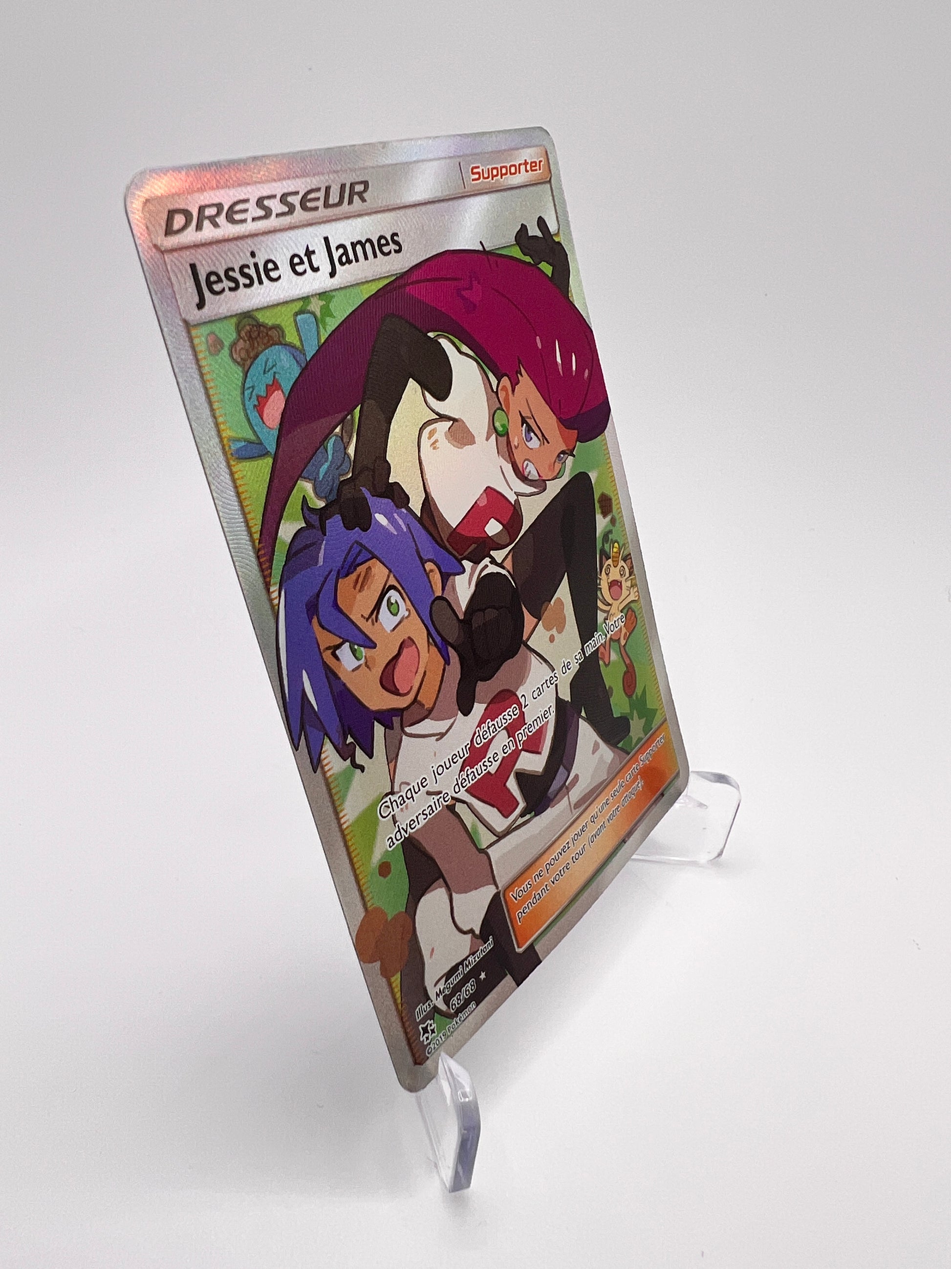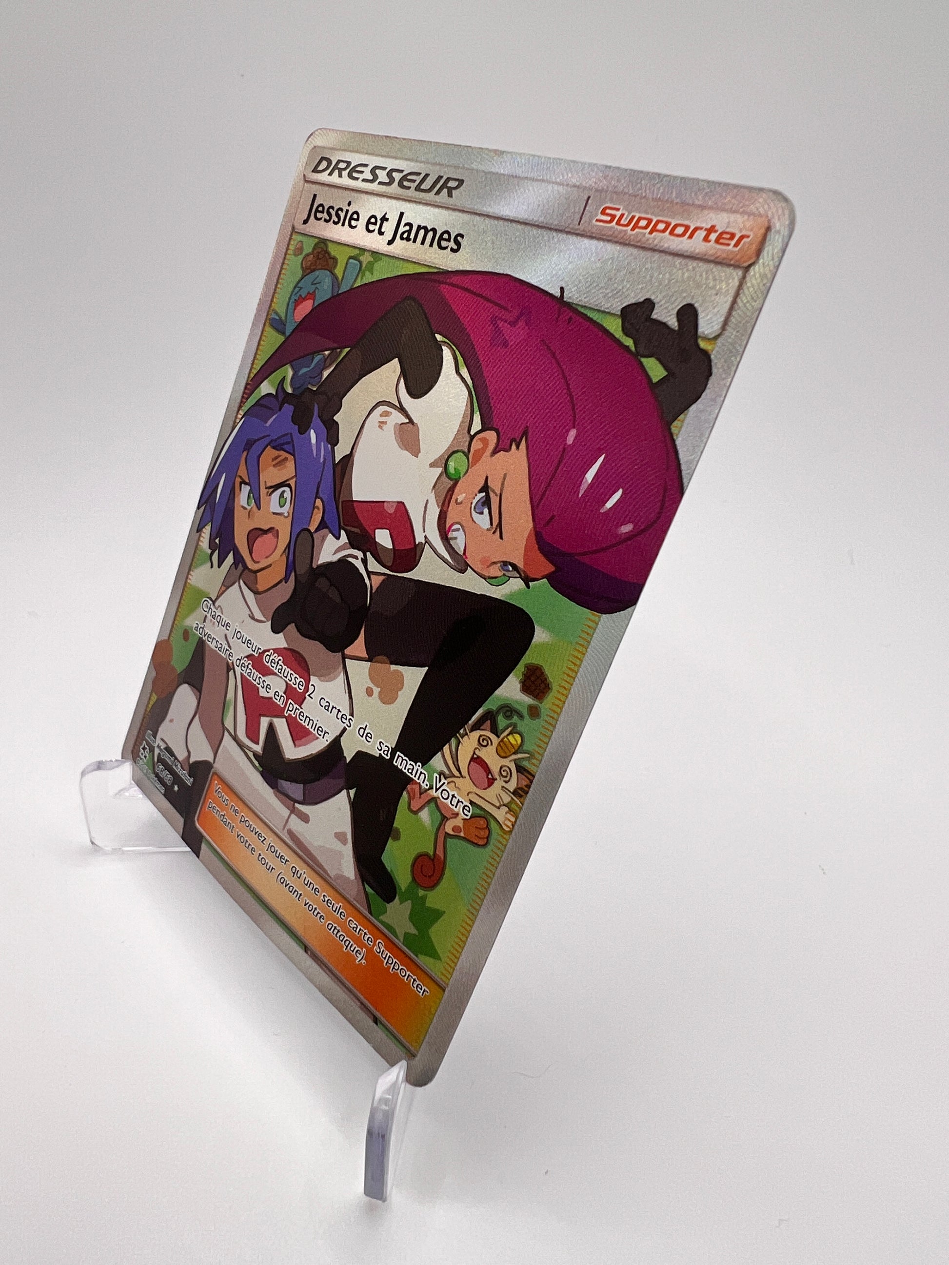 Retrouvez le duo le plus iconique de la Team Rocket avec cette carte Jessie et James, issue de l’extension Destinées Occultes. Entre nostalgie, humour et stratégie, cette carte Dresseur est un véritable clin d’œil aux fans de la série animée et du TCG Pokémon.
