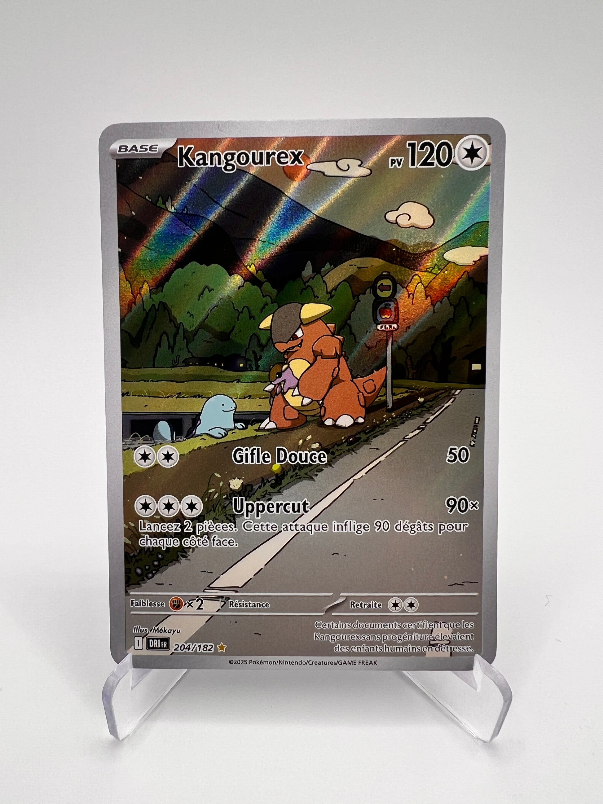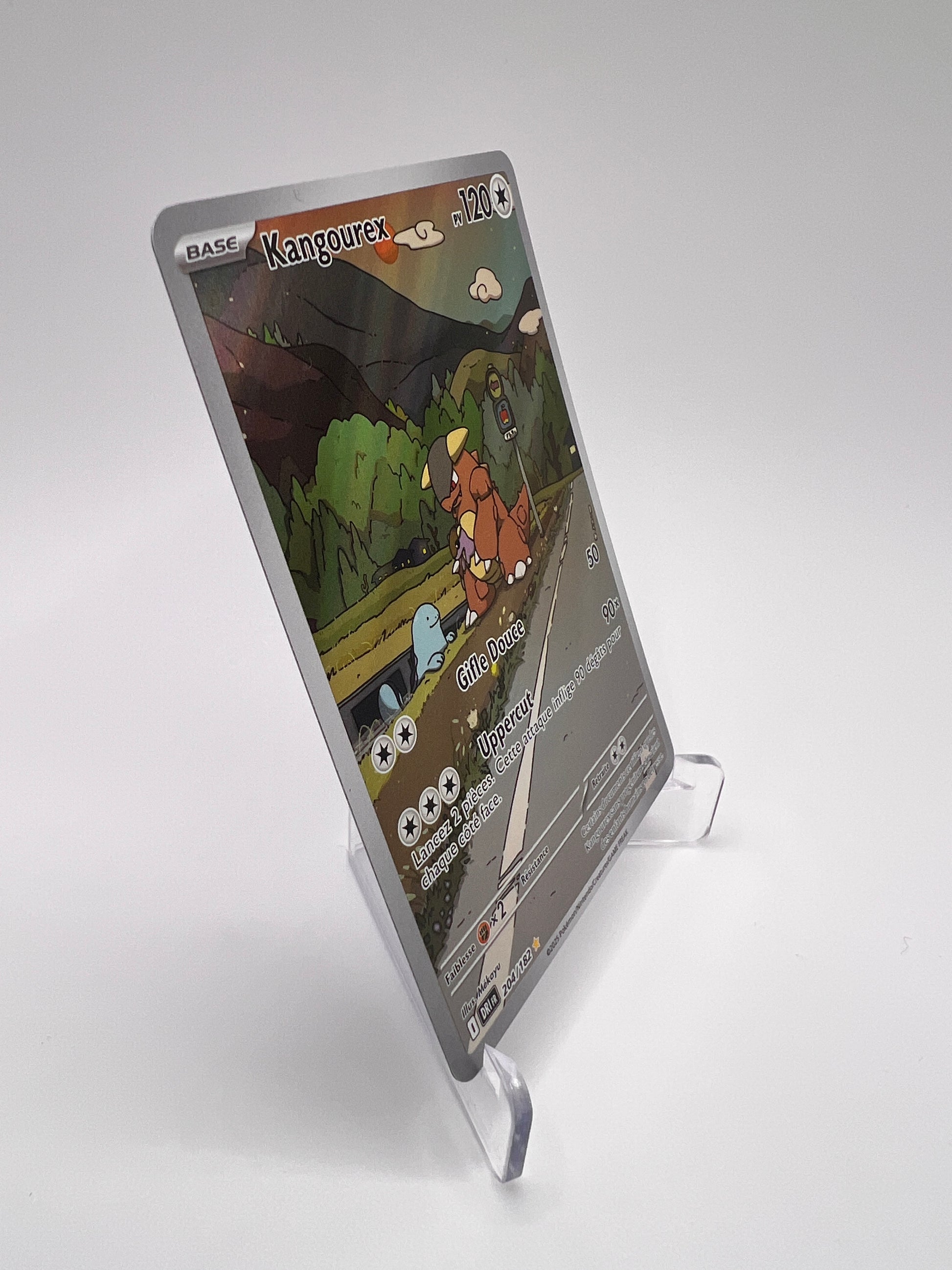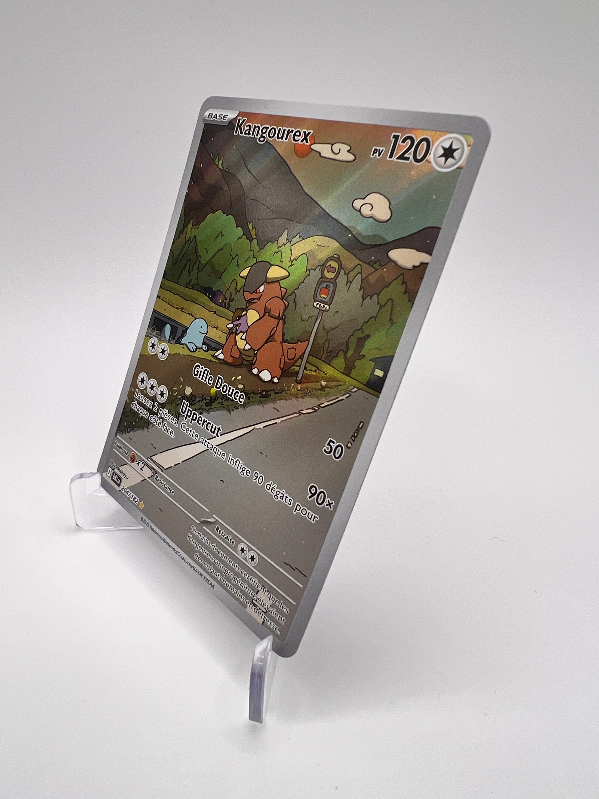 Kangourex est un Pokémon emblématique de Kanto, reconnu pour son instinct protecteur et la présence de son petit dans sa poche ventrale. Cette Illustration Rare hors set de Rivalités Destinées propose un artwork narratif très apprécié des collectionneurs EV. Une carte AR qui met en valeur le côté familial et iconique de ce Pokémon culte.