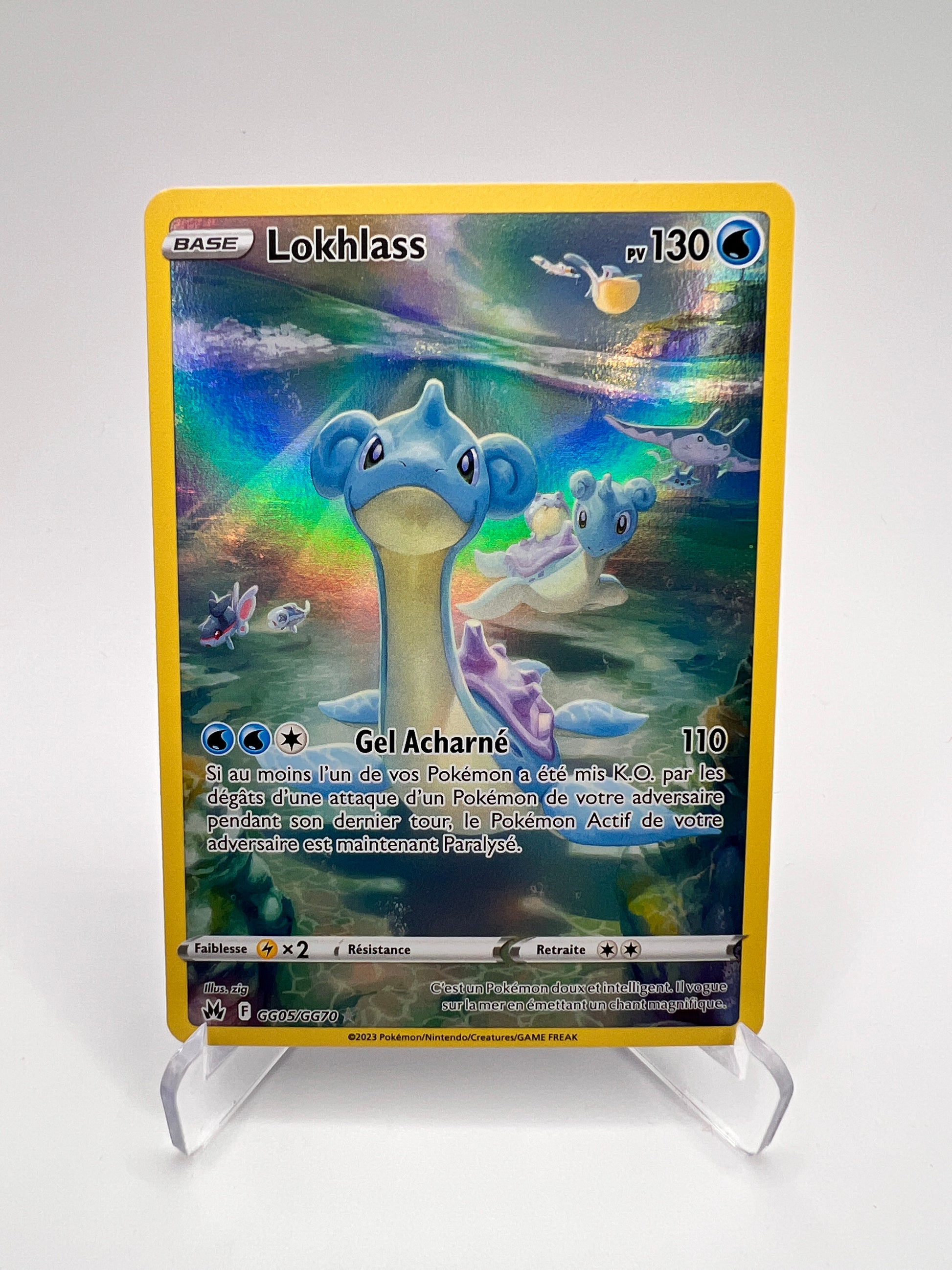 Lokhlass est un Pokémon emblématique de Kanto, apprécié pour son élégance et son rôle de compagnon marin dans l’univers Pokémon. Cette version Galarian Gallery de Zénith Suprême se distingue par un artwork narratif immersif très recherché par les collectionneurs. Une carte GG élégante qui apporte une vraie dimension artistique à une collection EB.