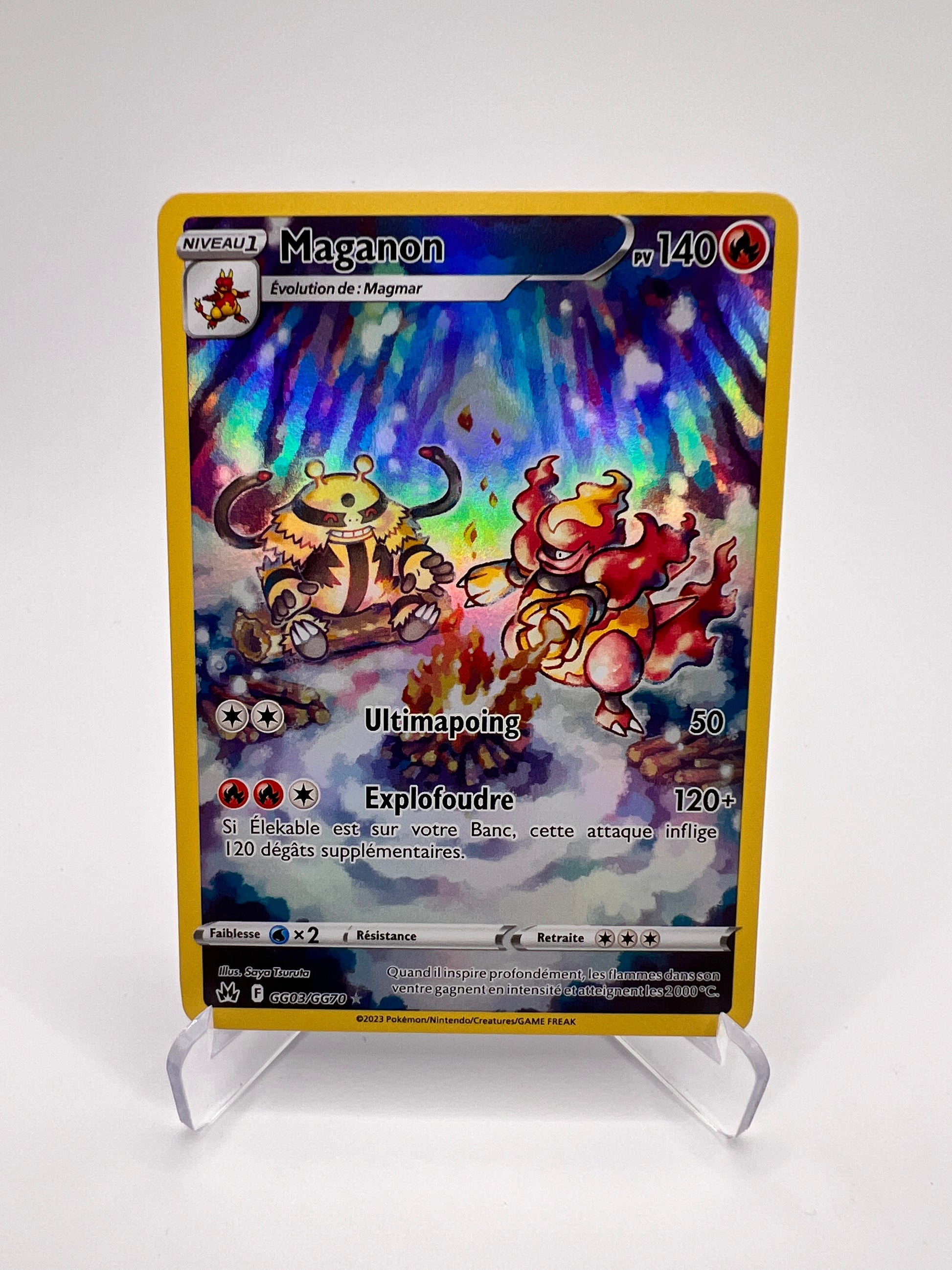 Maganon se distingue par sa puissance explosive et son design imposant issu de la 4G. Cette version Galarian Gallery de Zénith Suprême propose un artwork narratif riche et dynamique, très apprécié des collectionneurs de l’ère EB. Une carte GG recherchée pour compléter une collection orientée illustrations premium.