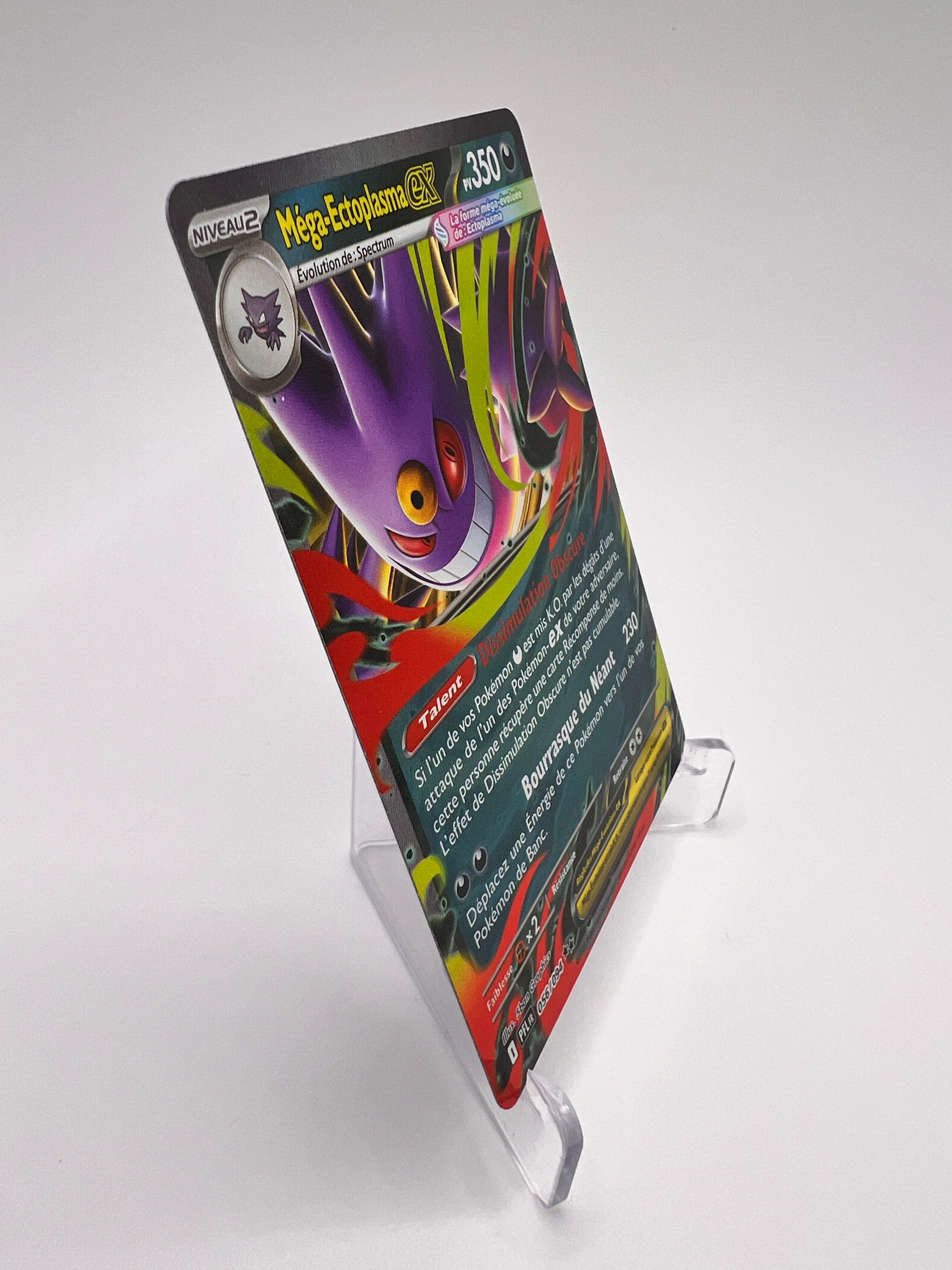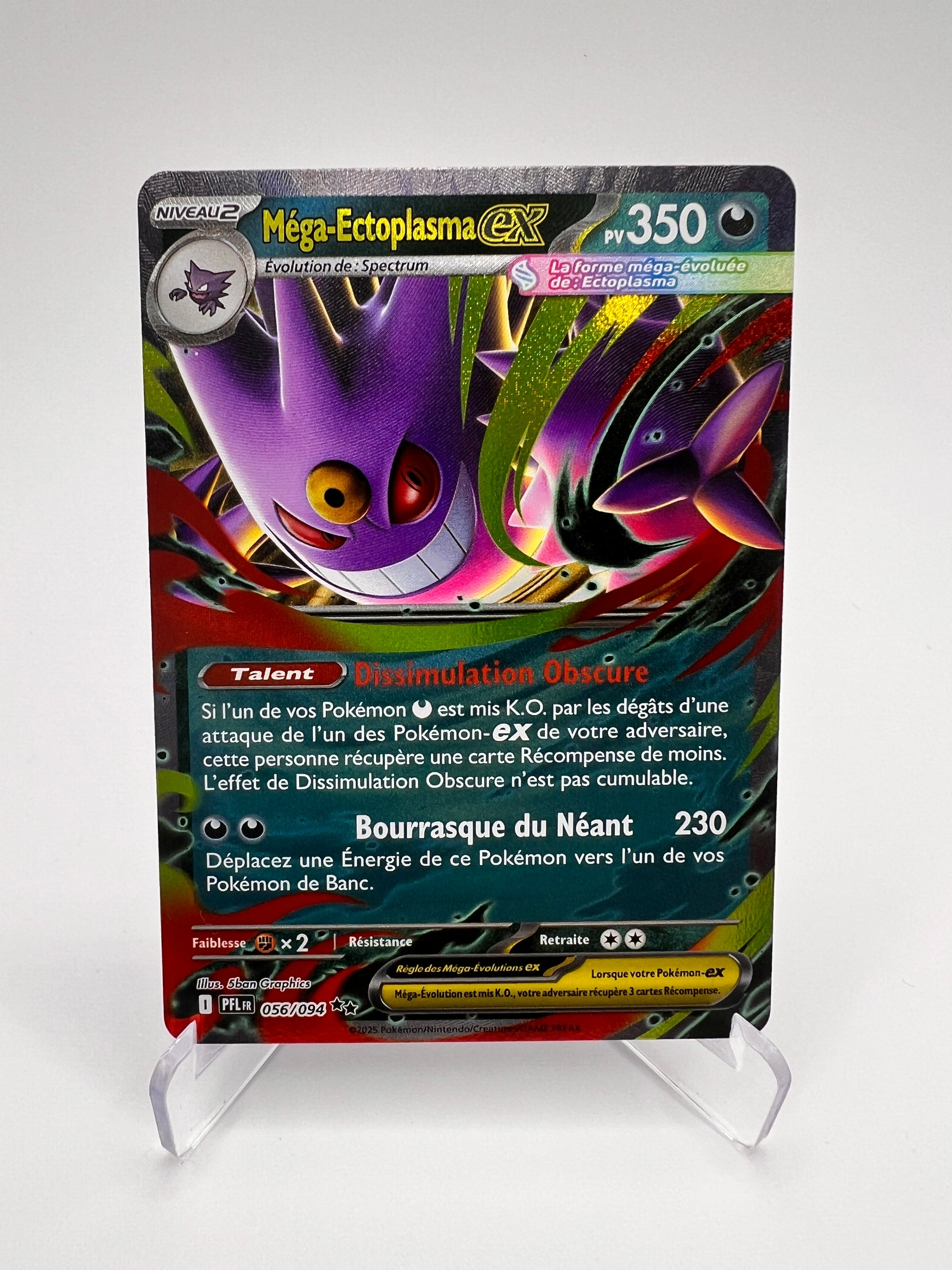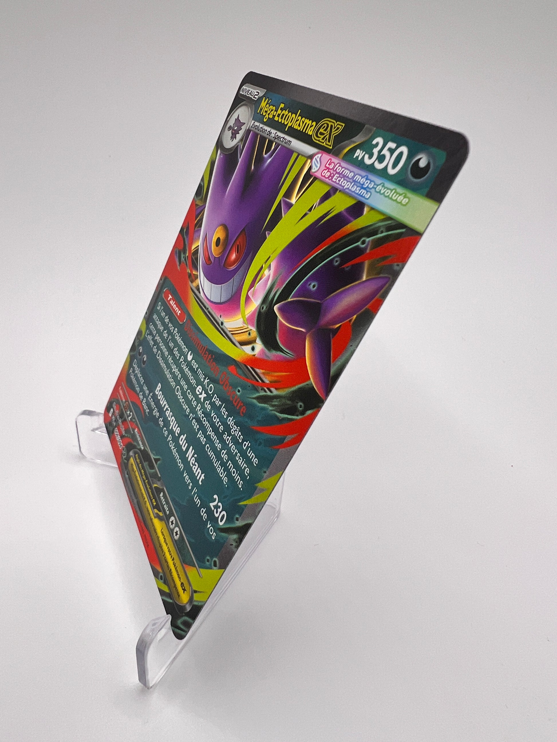 Méga-Ectoplasma incarne la malice et la puissance spectrale, figure culte depuis la 1G. Cette version ex Double Rarerenforce son aura menaçante avec une présence visuelle moderne et marquée. Une carte recherchée pour les collections orientées Méga et Pokémon Spectre emblématiques.
