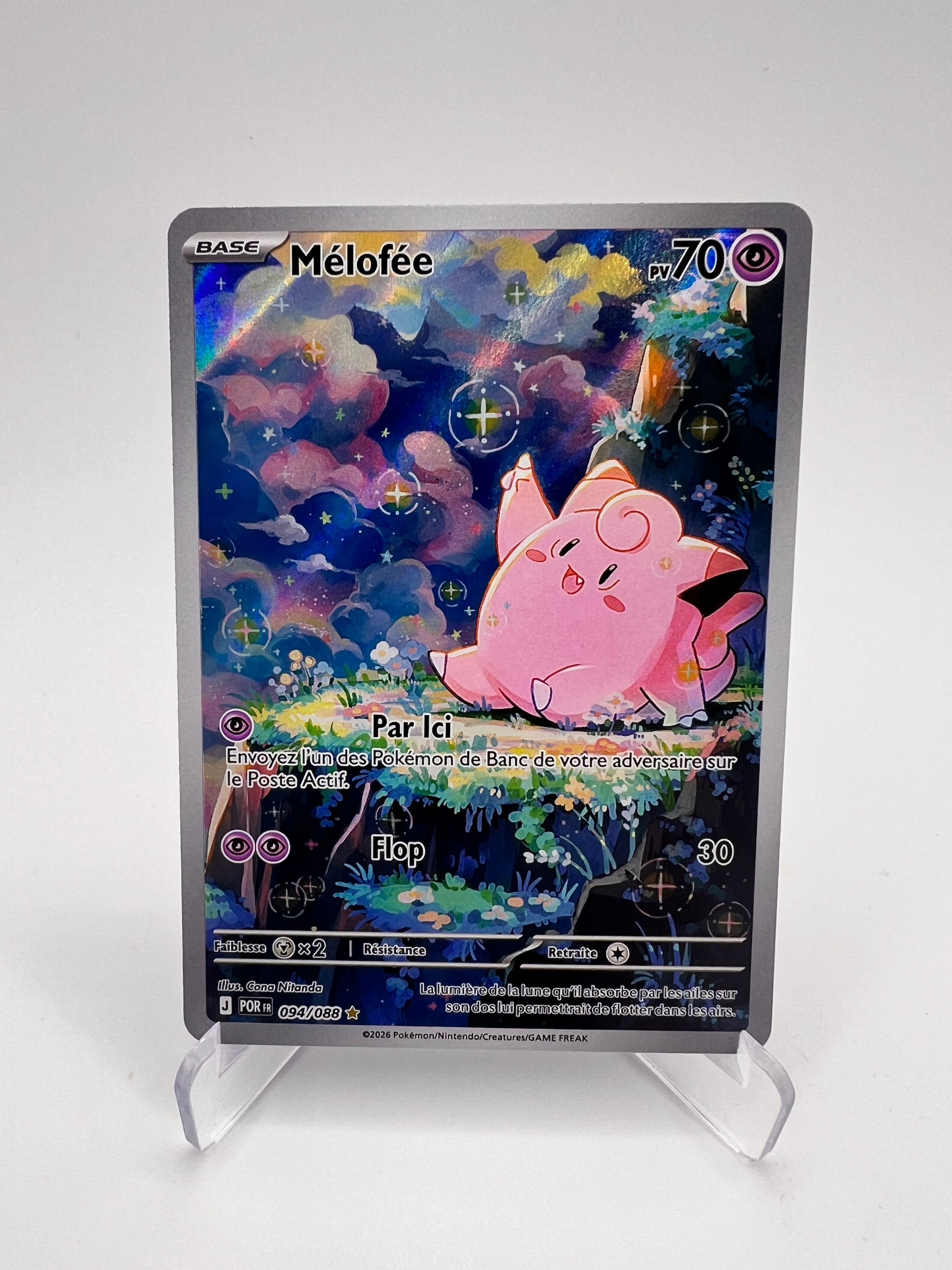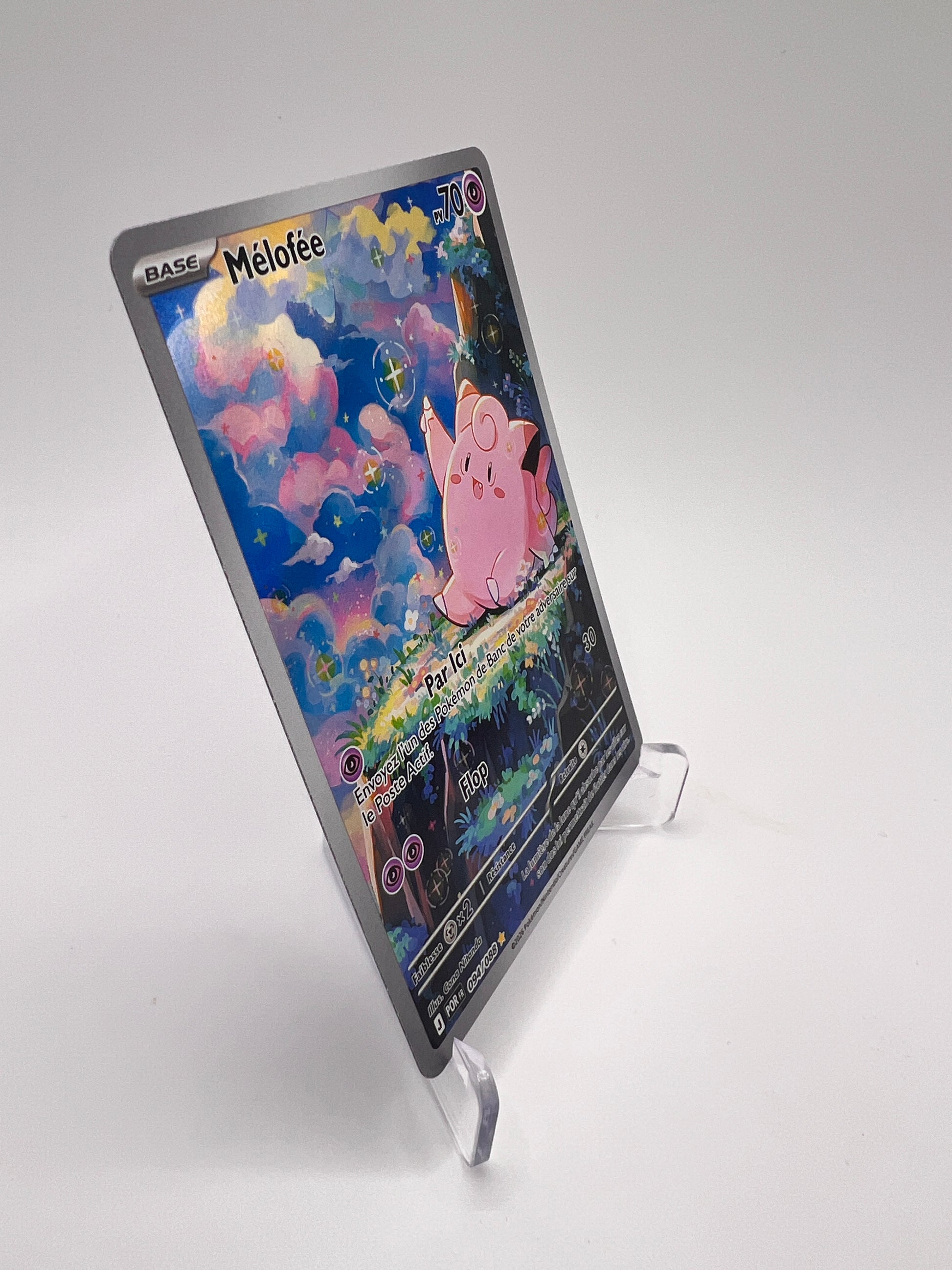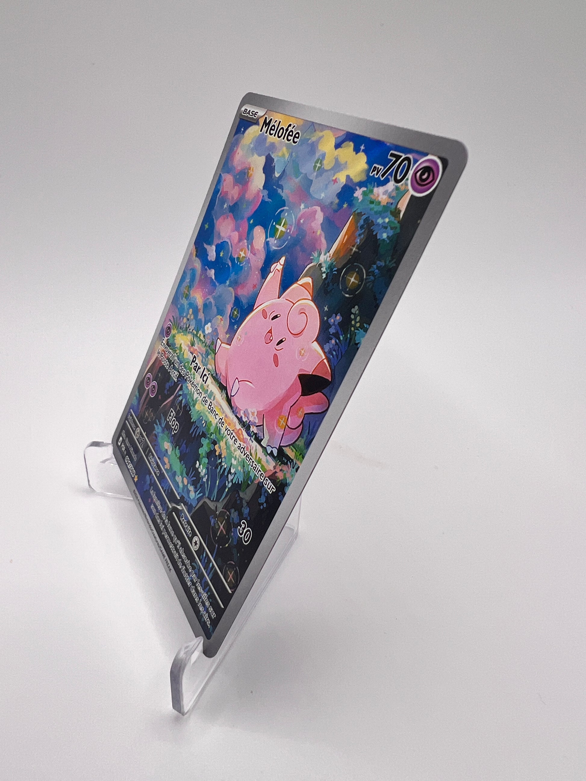 Mélofée bénéficie ici d’un visuel doux et immersif, mettant en valeur son univers féerique. Les cartes IR sont devenues incontournables dans les collections modernes grâce à leur qualité graphique supérieure et leur rareté intermédiaire recherchée.