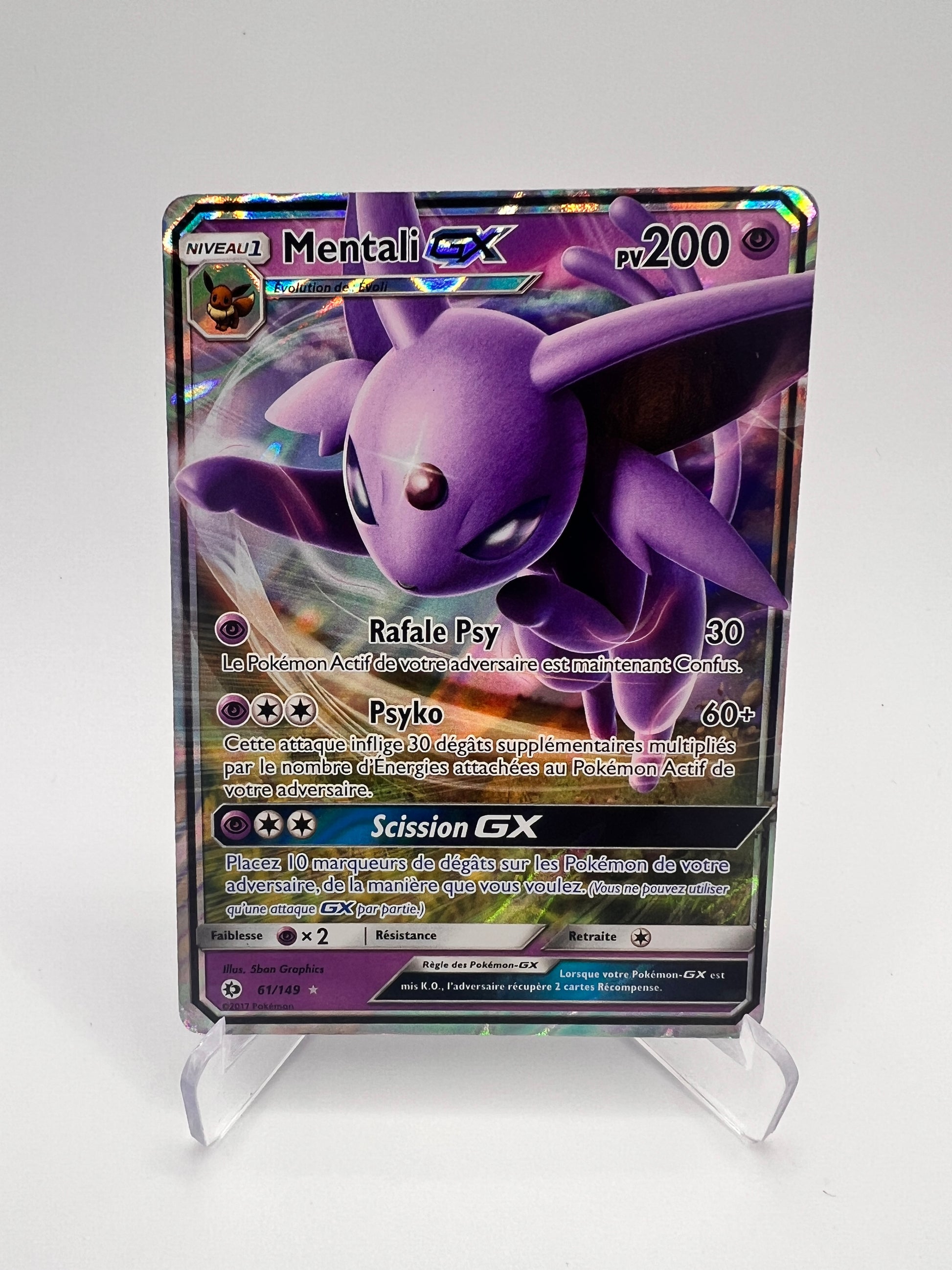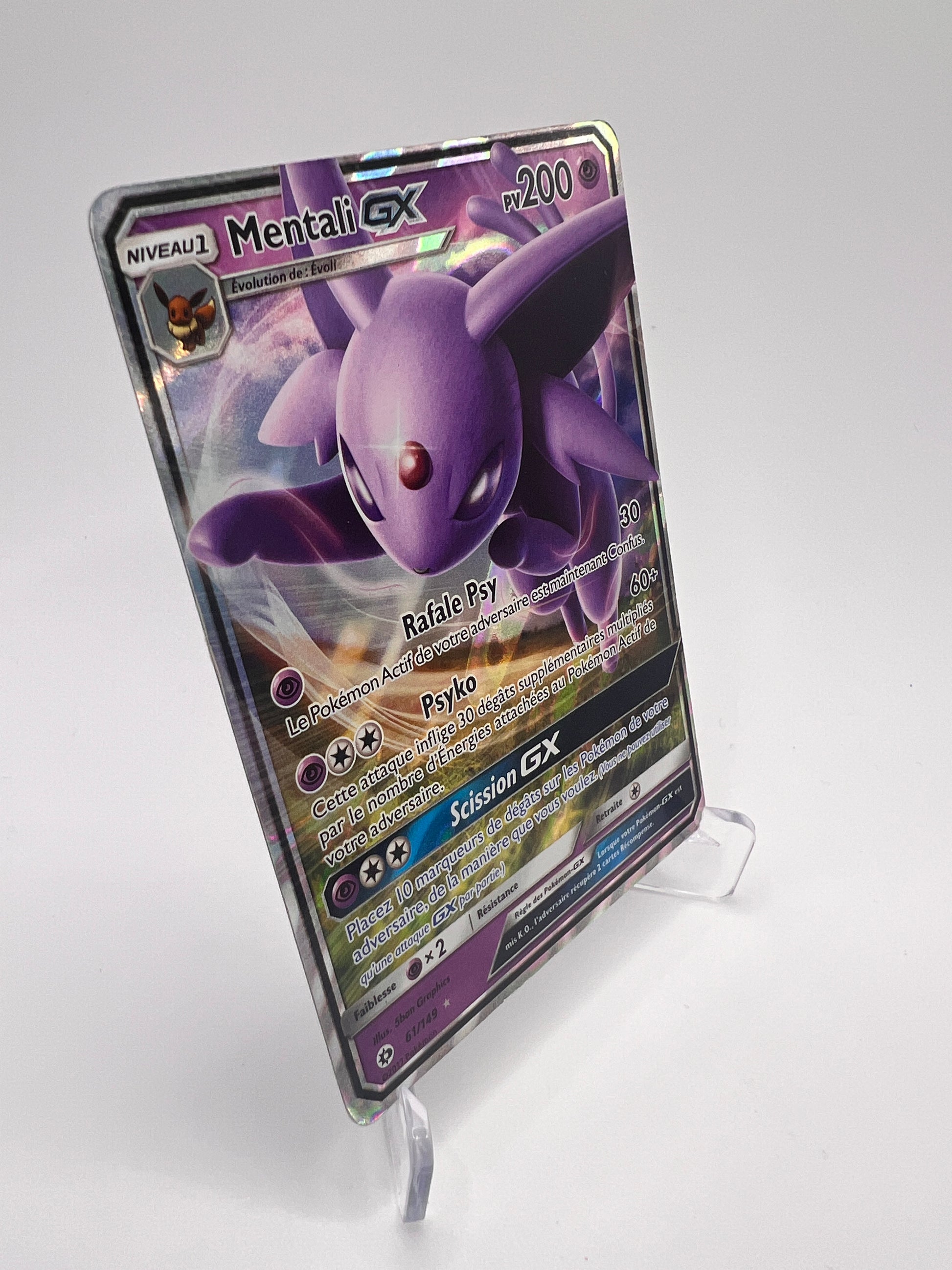 Mentali est l’une des évolutions d’Évoli les plus appréciées pour son élégance et son aura psychique. Cette version GX du set Soleil & Lune combine puissance moderne et attrait iconique, ce qui en fait une carte recherchée pour les collections centrées sur Évoli et ses évolutions. Un classique solide de l’ère SM.