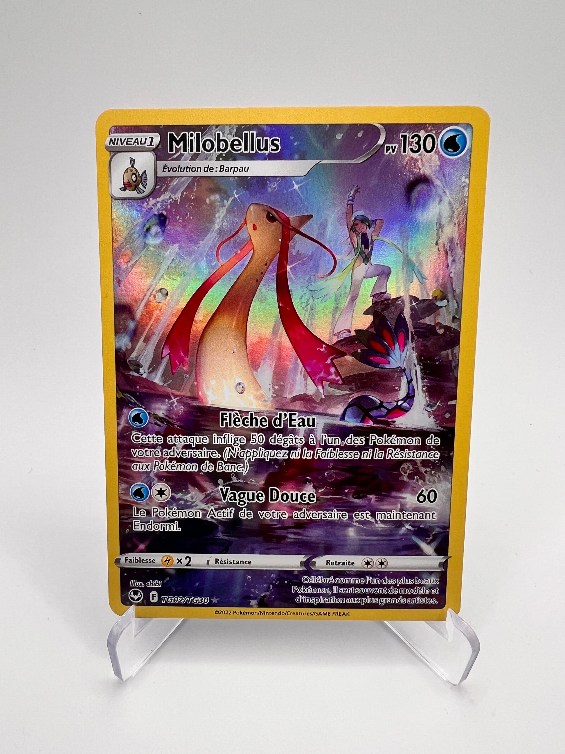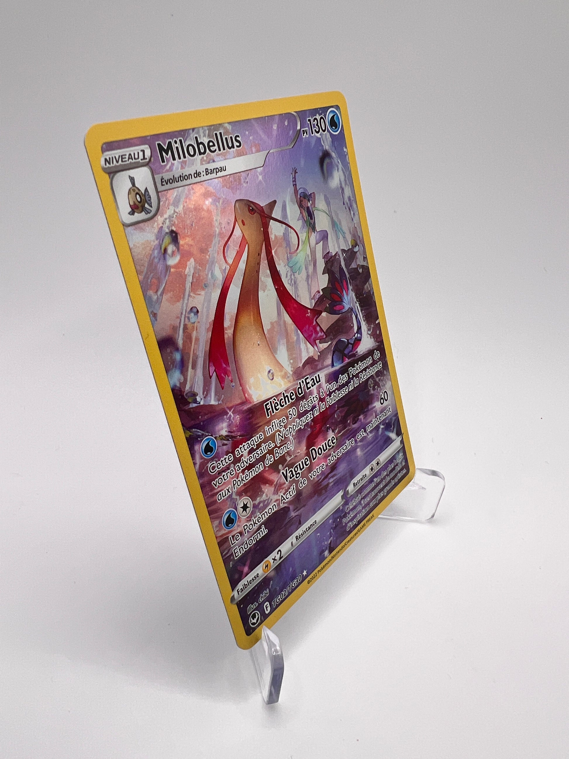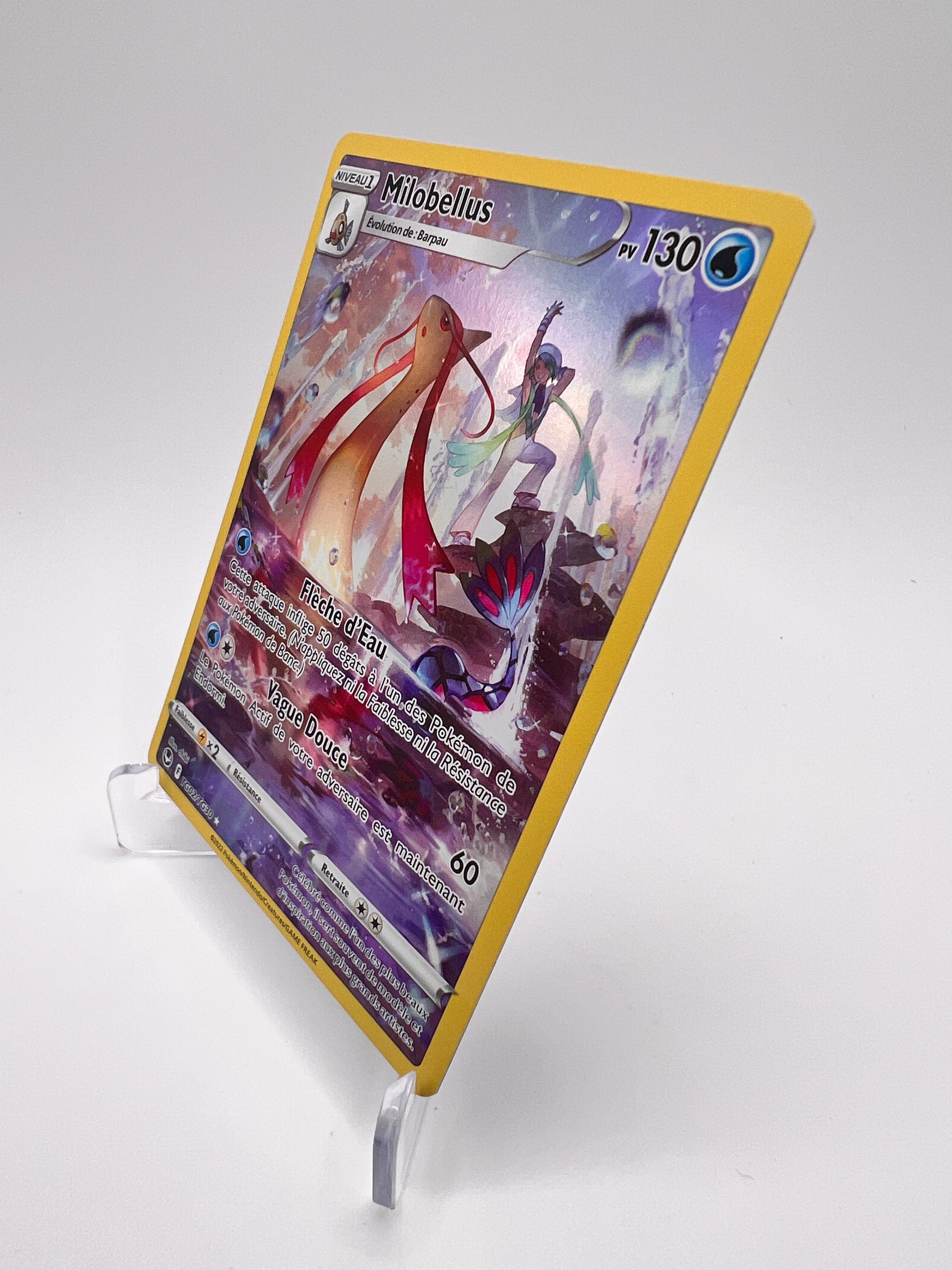 Milobellus est l’un des Pokémon les plus élégants et emblématiques de la licence, symbole de grâce et de rareté. Cette version Trainer Gallery met en avant un artwork narratif premium, très recherché pour sa dimension artistique et son intégration hors set. Une carte prisée des collectionneurs orientés TG et visuels haut de gamme.
