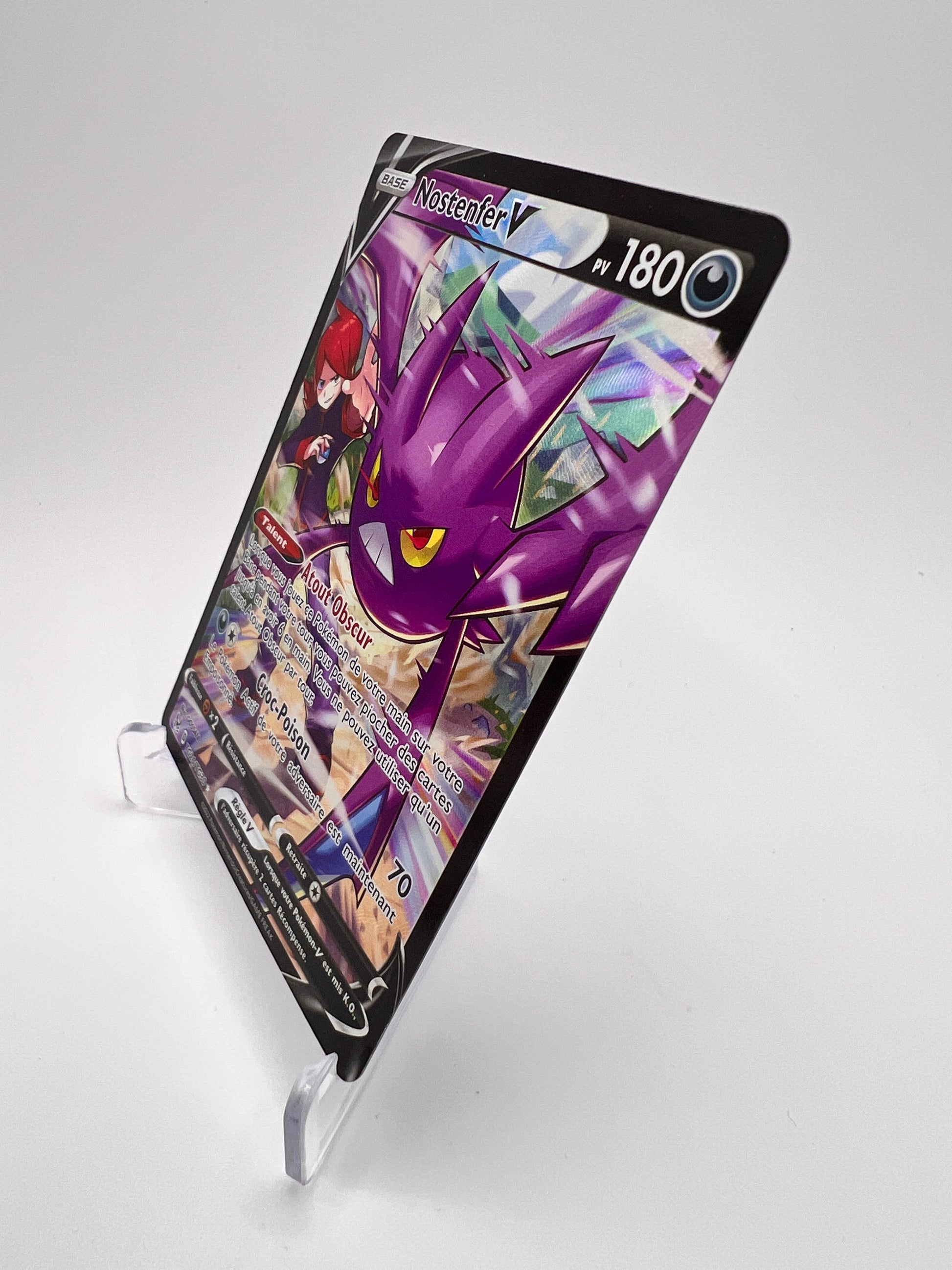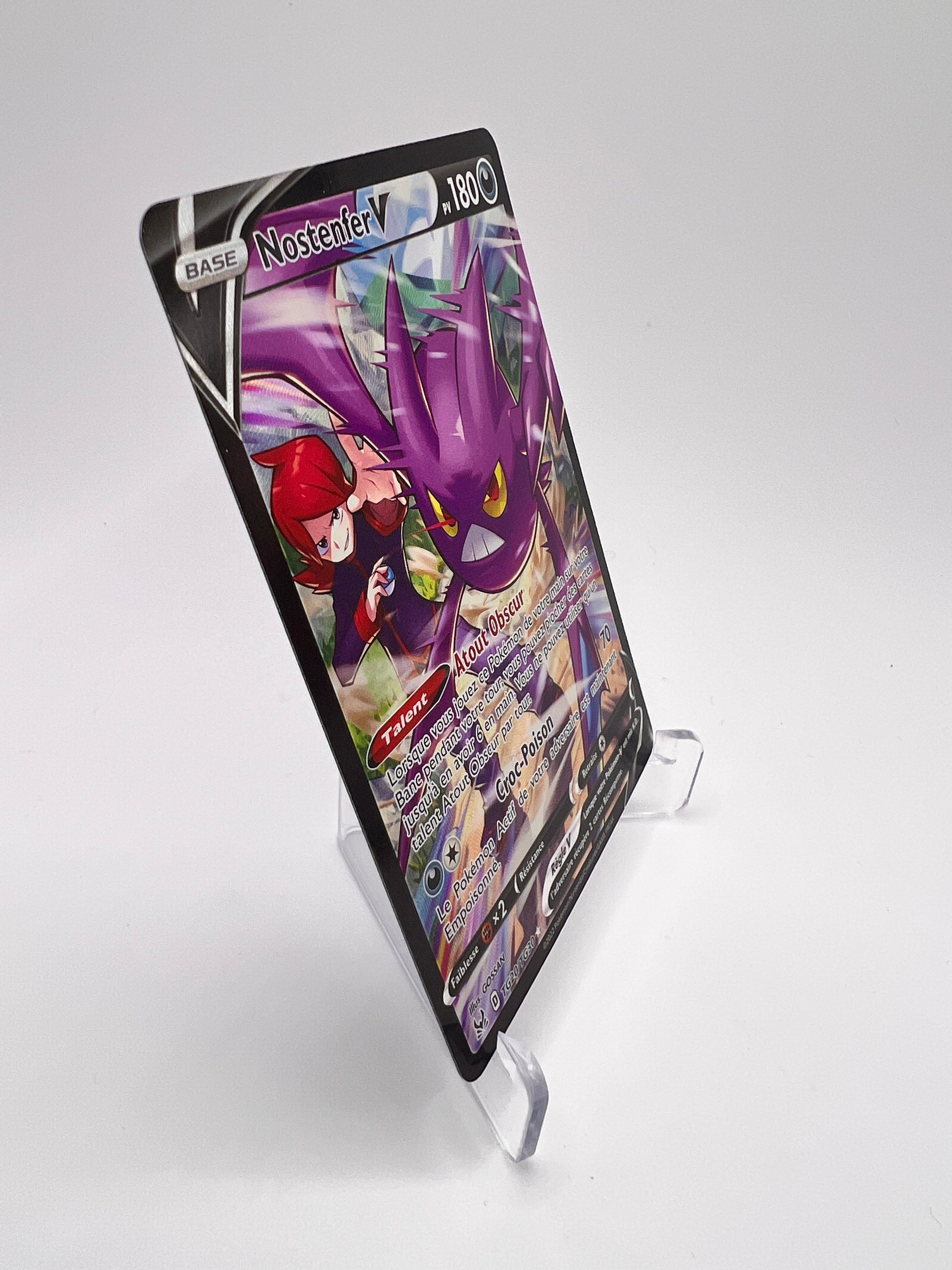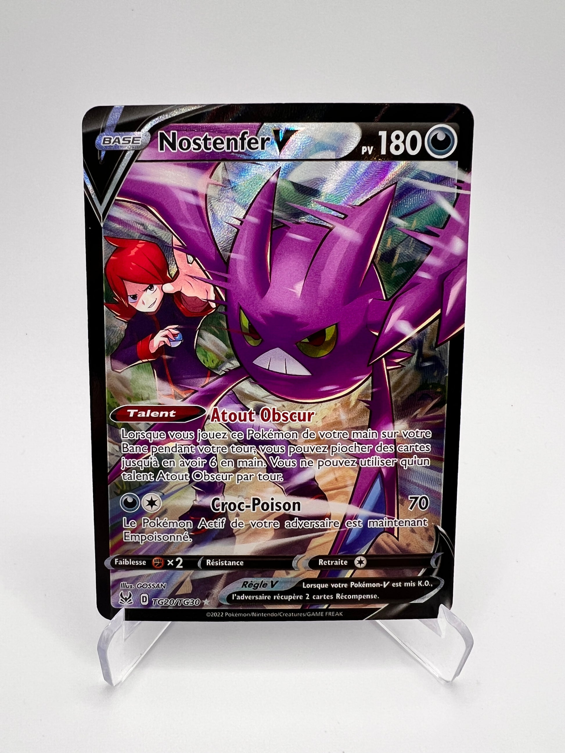 Nostenfer est un Pokémon emblématique pour sa vitesse et son style agressif, très apprécié depuis les premières générations. Cette version Trainer Gallery se démarque par un artwork narratif premium, recherché pour sa forte identité visuelle. Une carte solide pour les collections TG modernes orientées Épée & Bouclier.