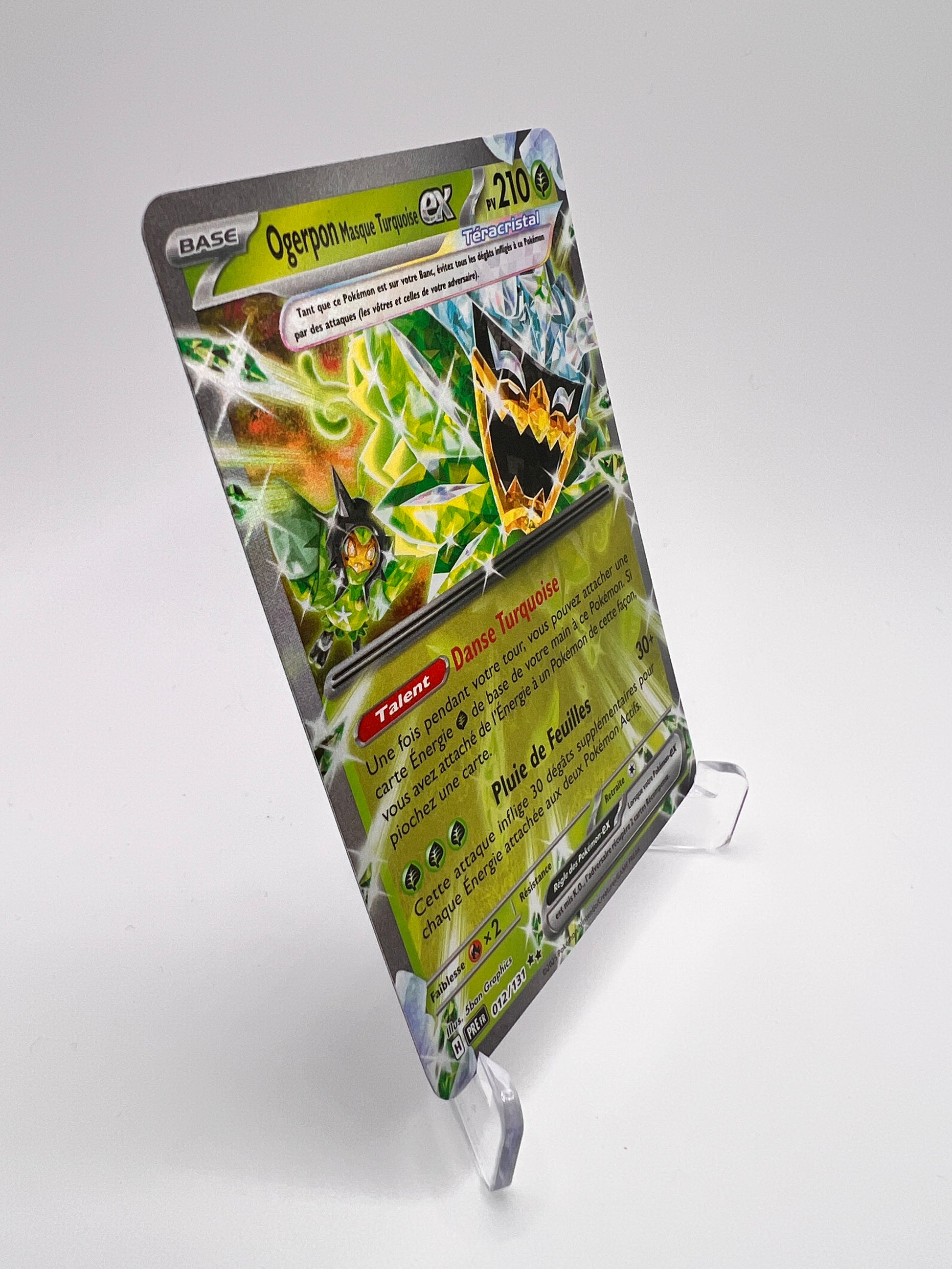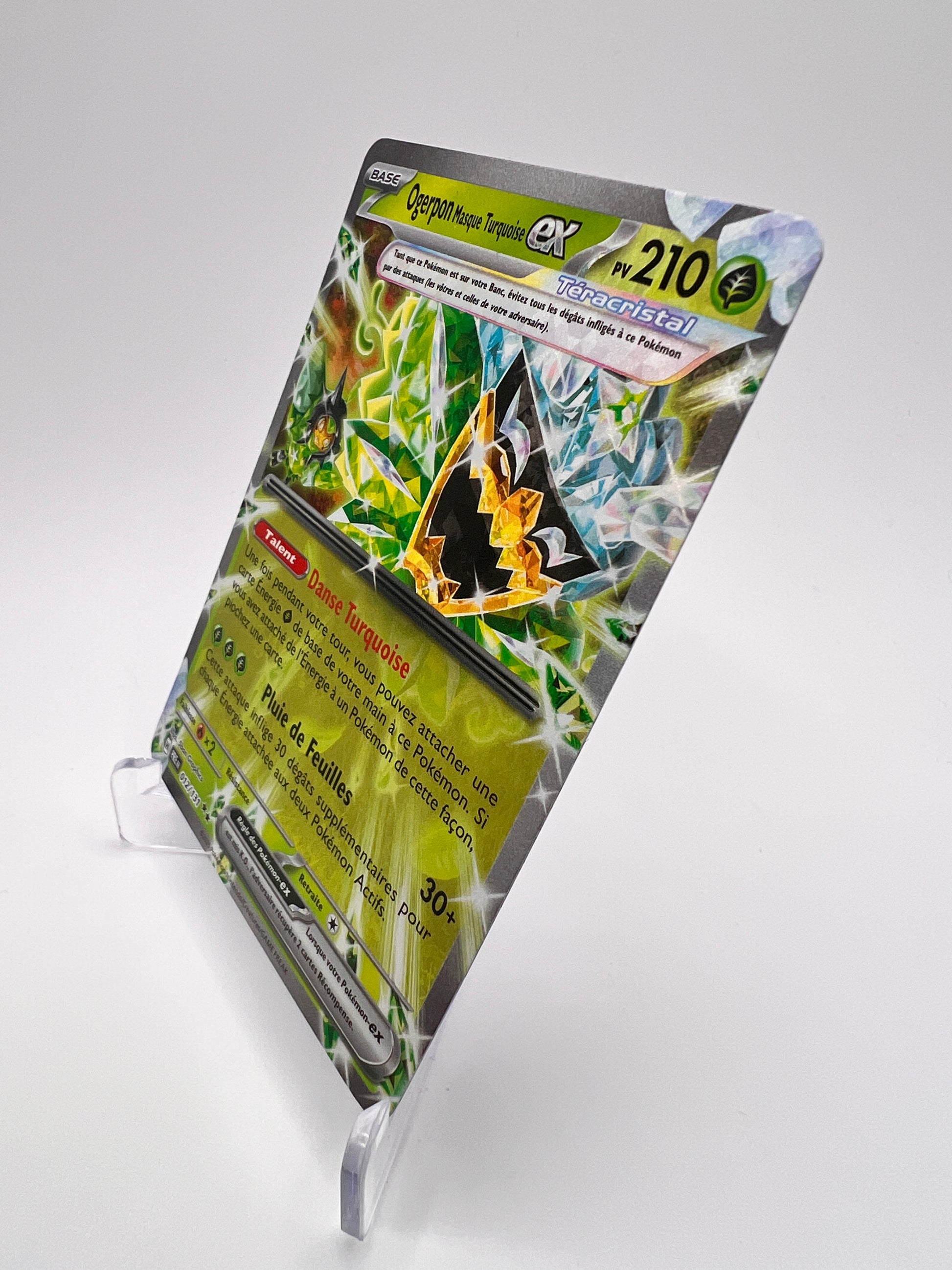 🔍 Spécificité Pokémon : Ogerpon change de masque pour adapter son pouvoir — le Masque Turquoise symbolise l’équilibre et la maîtrise, une signature forte qui séduit les collectionneurs amateurs de lore et de designs marqués.