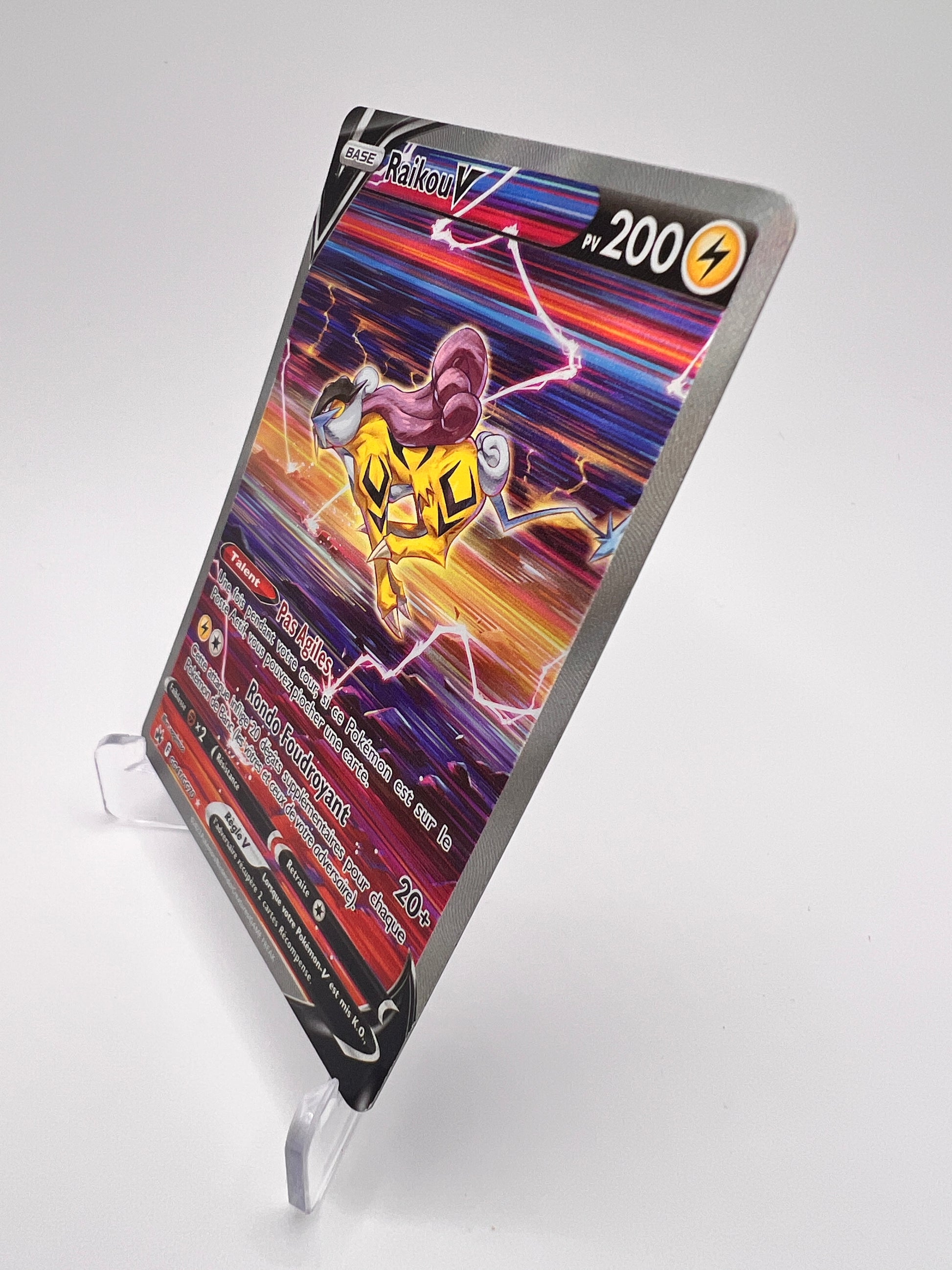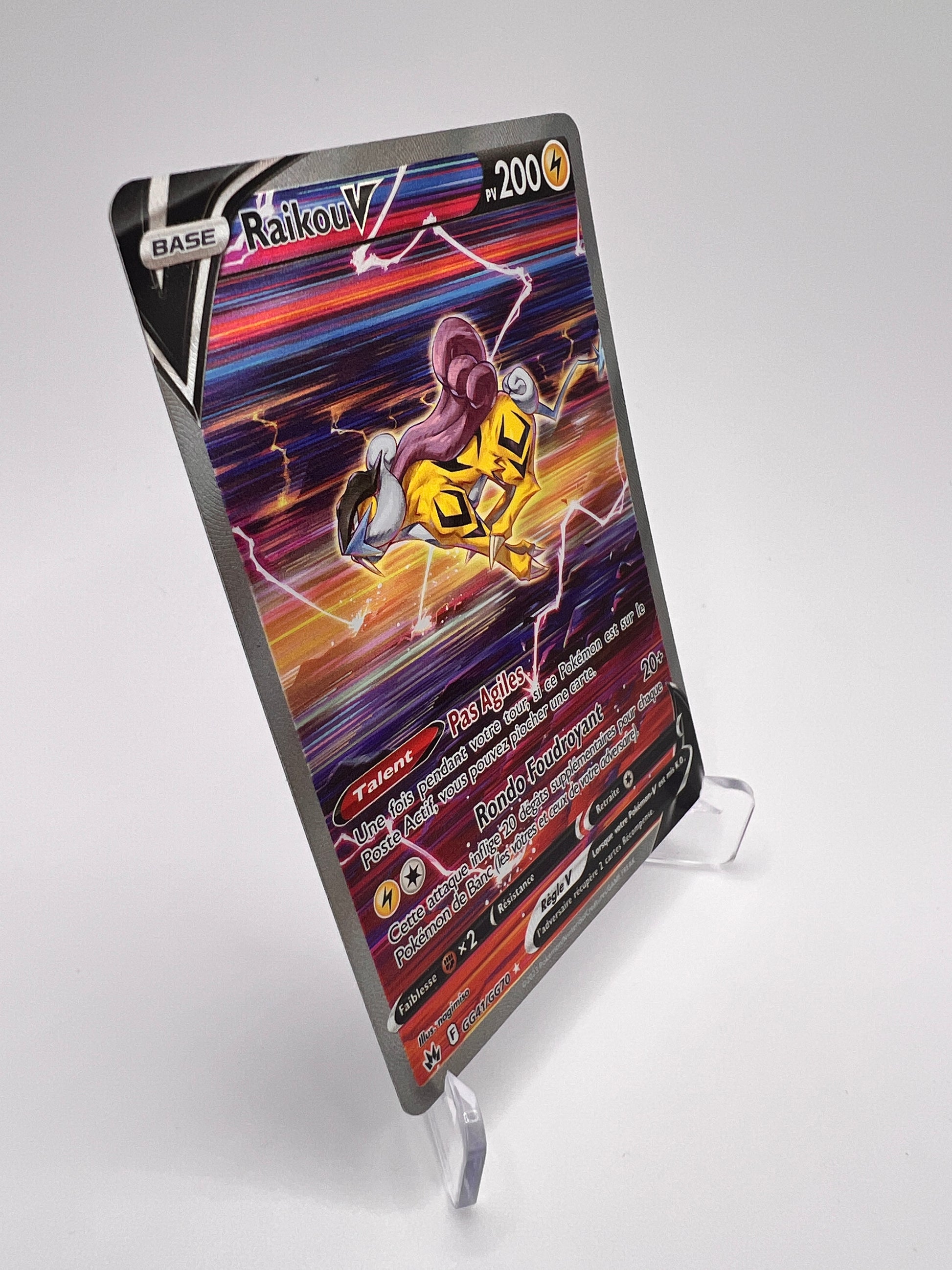 Raikou, l’un des légendaires emblématiques de Johto, incarne la puissance brute de la foudre. Cette version Galarian Gallery SIR est particulièrement recherchée pour son artwork spectaculaire mettant en scène Raikou en mouvement dans un décor urbain dynamique. Une carte premium très appréciée des collectionneurs de Zénith Suprême et des amateurs de légendaires.