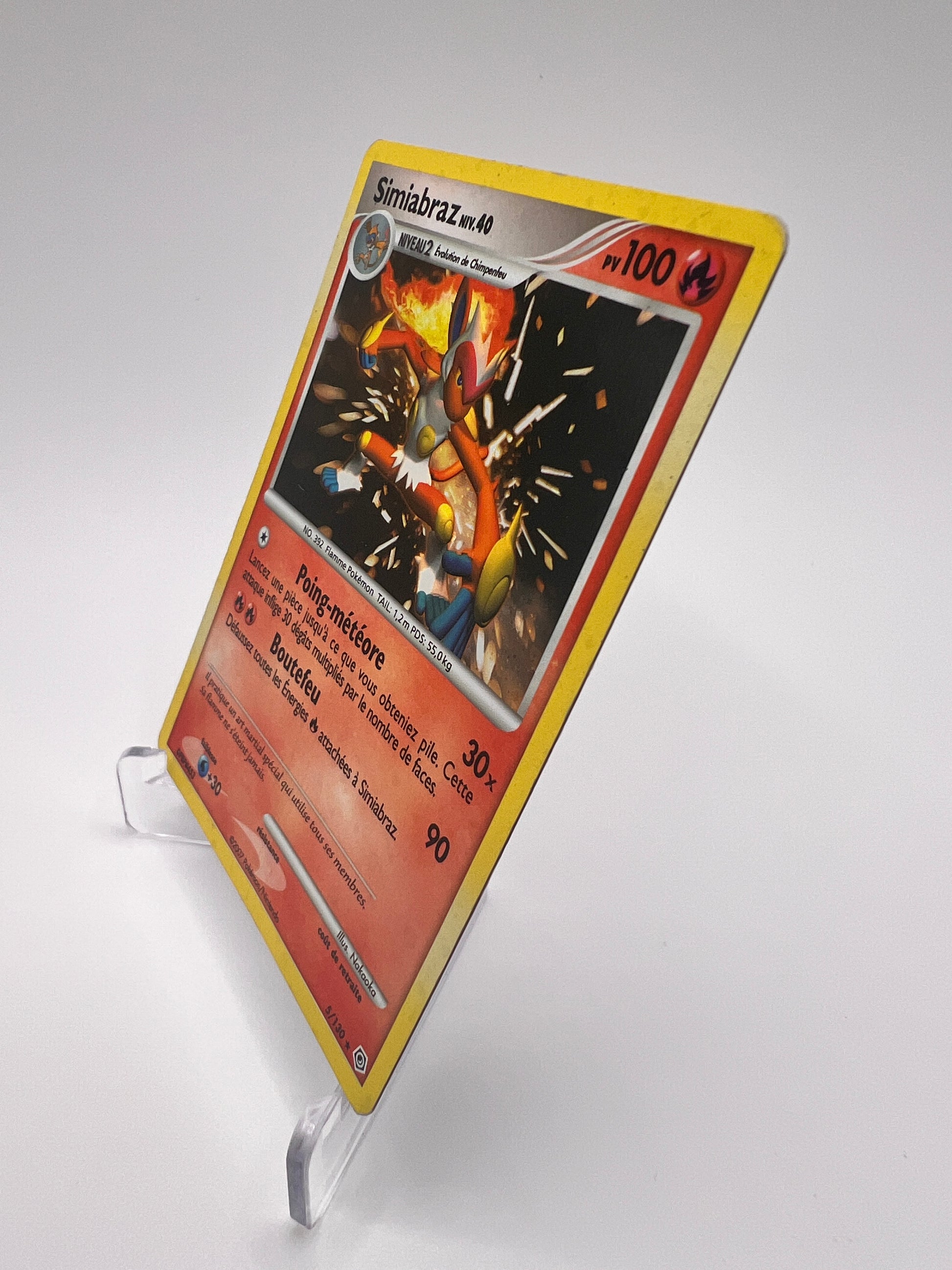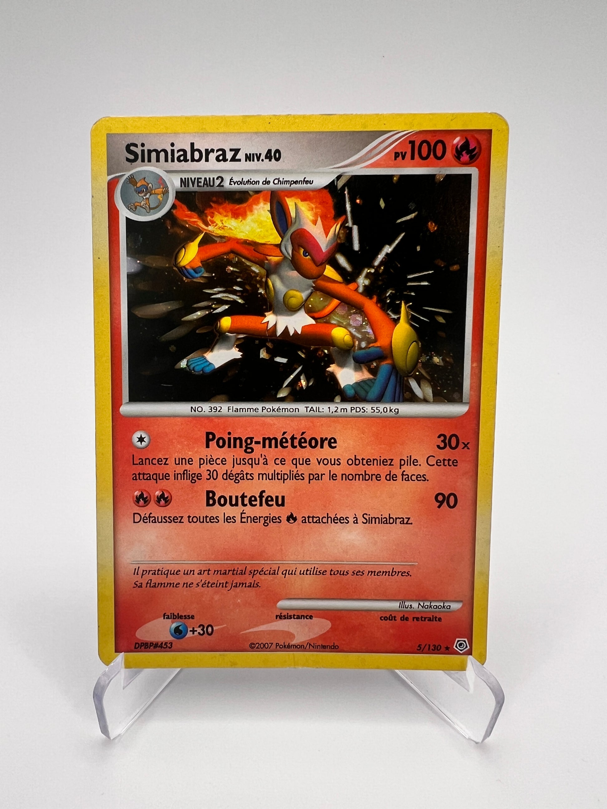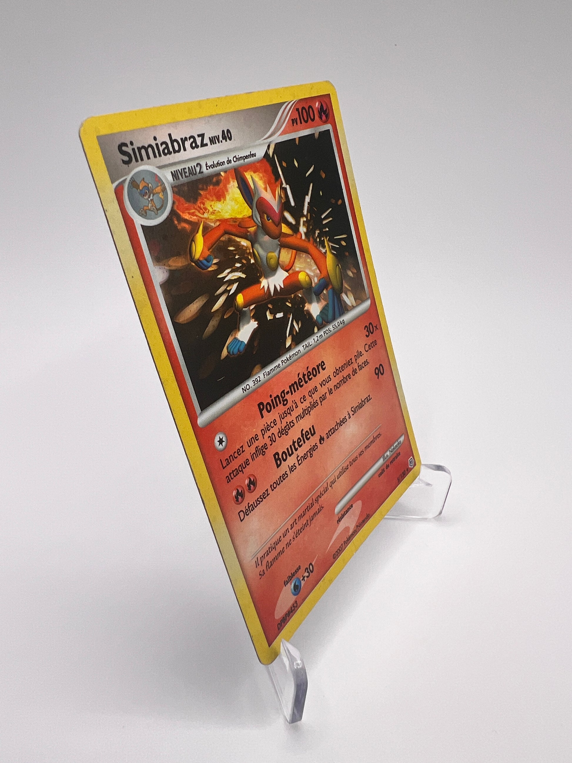 Simiabraz est l’évolution finale du starter Feu de Sinnoh et l’un des Pokémon les plus populaires de la 4G. Connu pour sa vitesse et son style de combat inspiré des arts martiaux, il incarne parfaitement l’agressivité et la puissance du type Feu/Combat. Cette carte vintage de l’ère Diamant & Perle est très appréciée des collectionneurs attachés aux premières séries de Sinnoh.