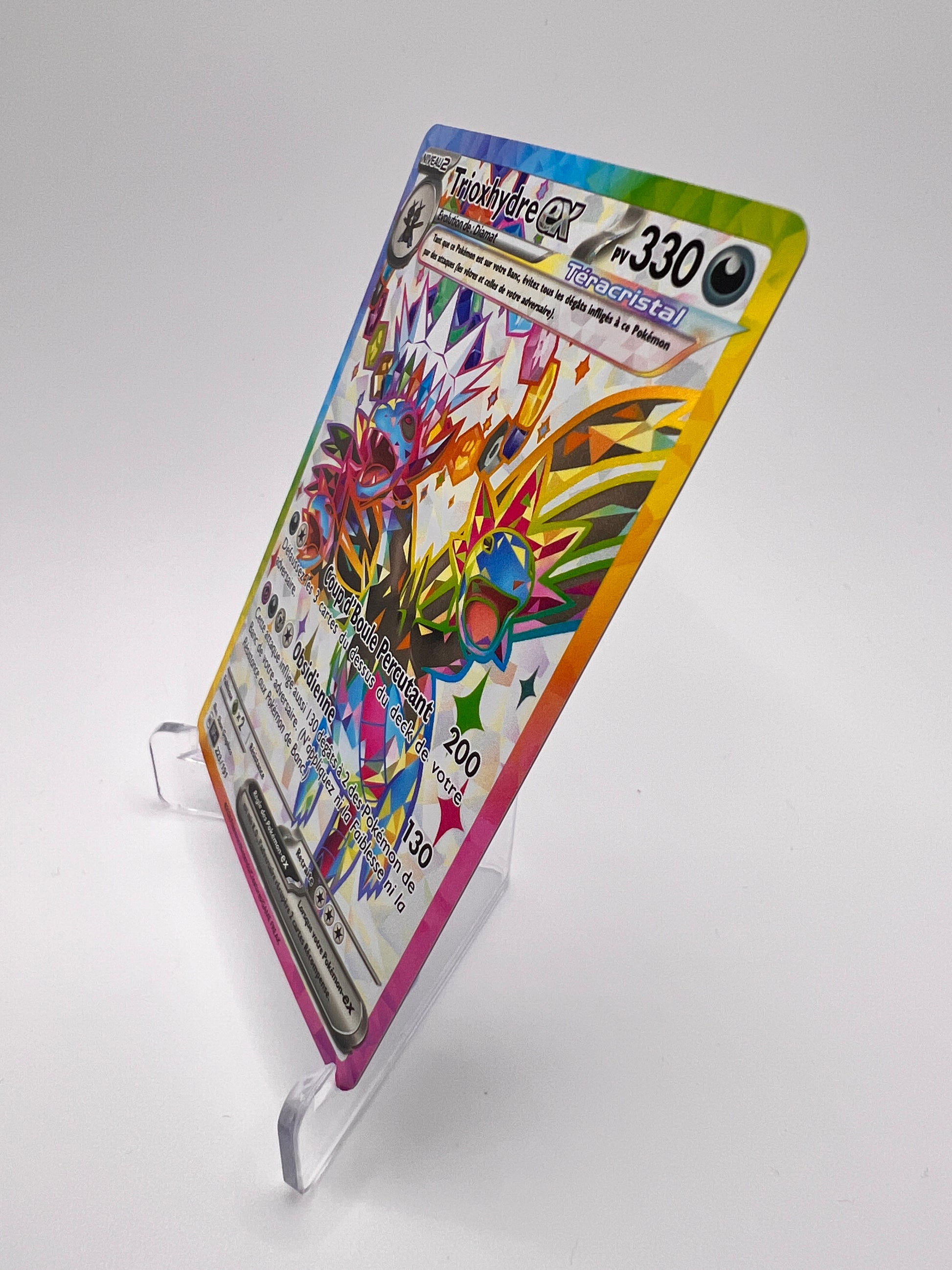 Carte ex Ultra Rare au rendu cristallin massif. Trioxhydre version Téracristal, c’est l’intimidation à l’état pur : silhouettes multiples, éclats facettés, présence immédiate. Une pièce qui s’impose dans un binder ex, un master set Étincelles Déferlantes, ou une collec Dragons modernes.