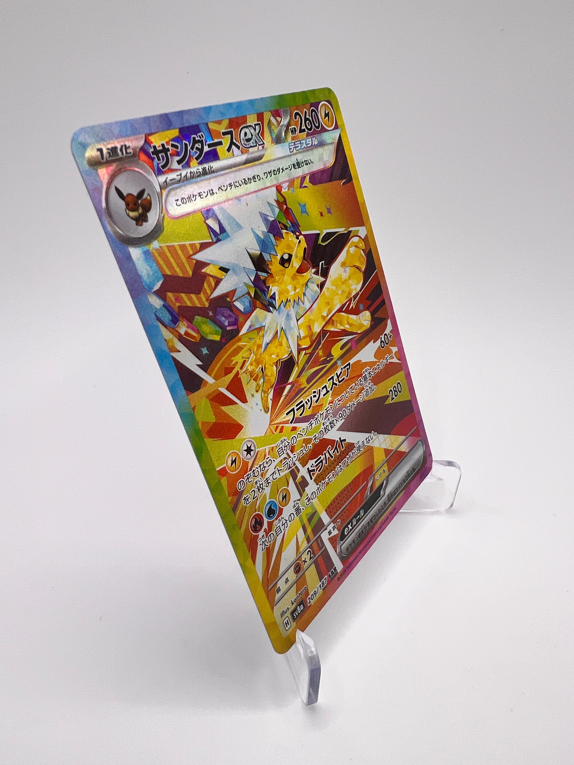 Voltali, évolution emblématique d’Évoli, bénéficie ici d’un visuel puissant et immersif, très recherché par les collectionneurs. Le set japonais sv8a est particulièrement apprécié pour sa qualité d’impression supérieure et ses finitions premium.