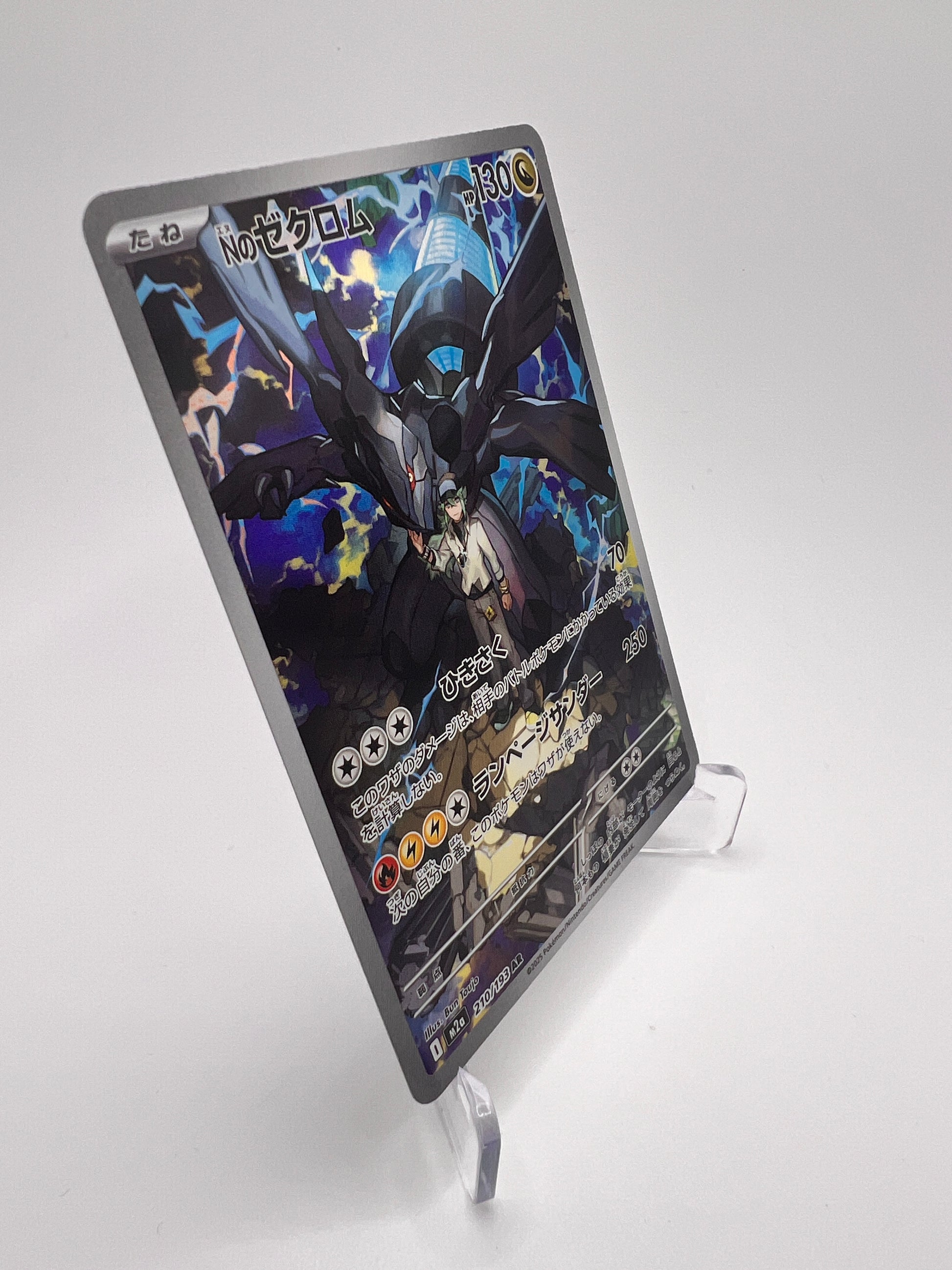 Découvrez Zekrom de N M2A-210, une carte secrète japonaise issue de la série Méga Dream. Cette illustration met en scène le légendaire Zekrom accompagné de N, dans une composition puissante et contrastée qui rappelle leur lien emblématique dans les jeux Pokémon Noir & Blanc.